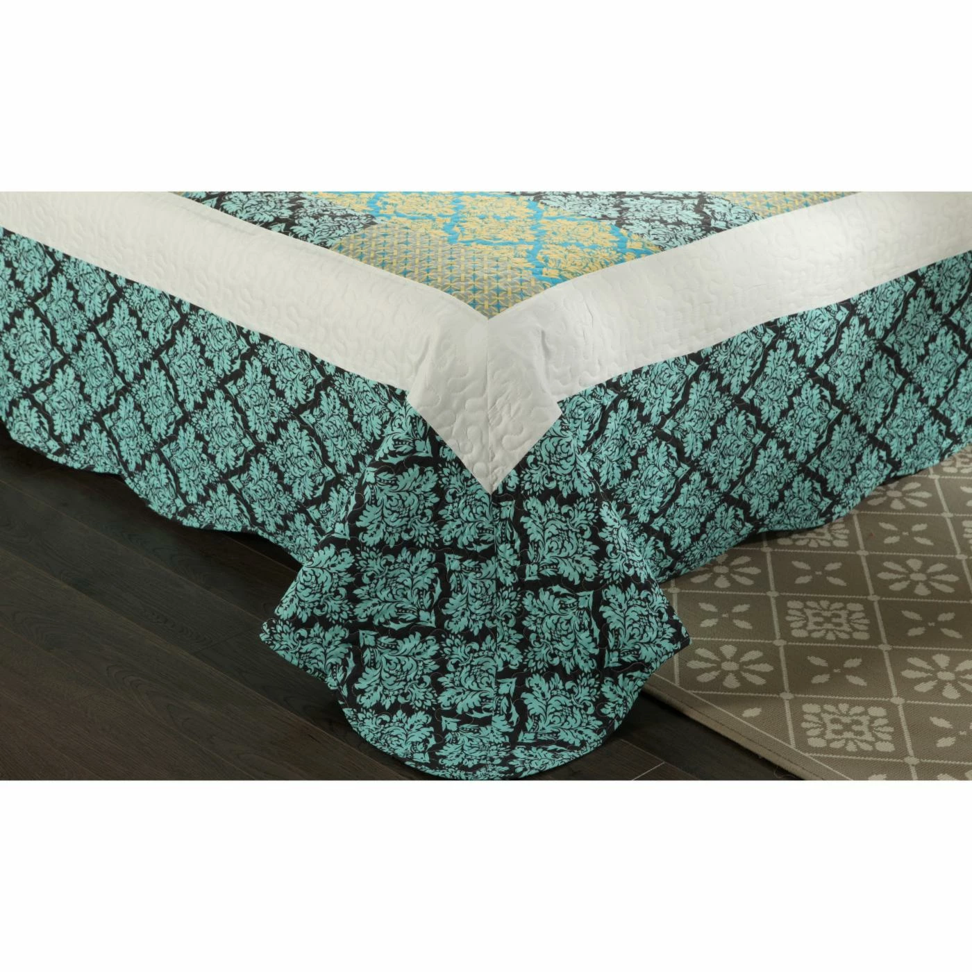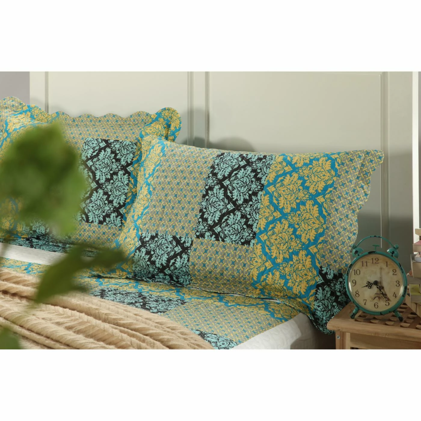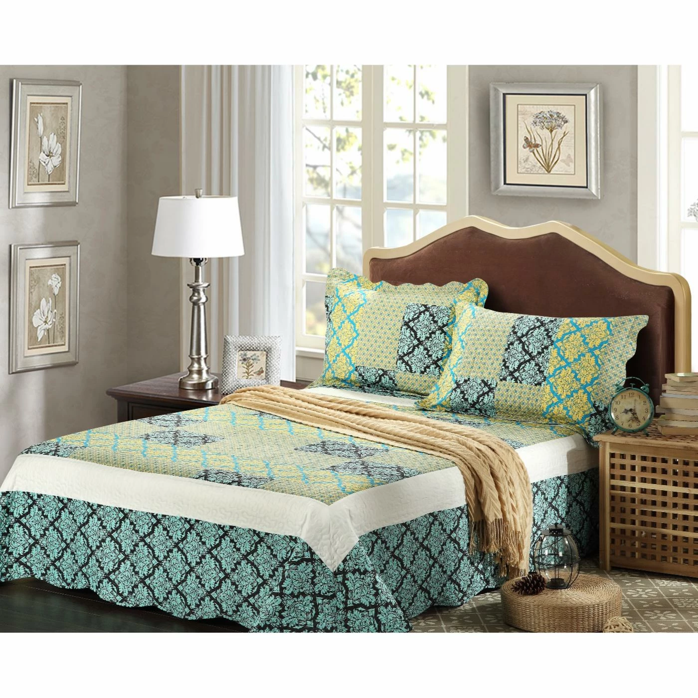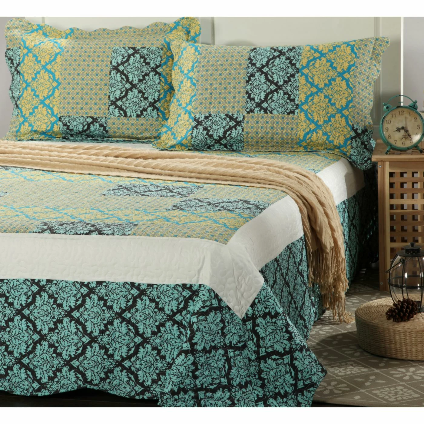 Refresh your bedroom in minutes with the Blue Ivy Damask 3 Piece Patchwork Quilt Set by Tache Home Fashion in a modern blend of yellows and blues. This casual-chic quilt set is crafted of soft, cozy polyester for year-round use and is machine washable for hassle-free cleaning. Matching shams are included to give your room a thoughtful, pulled-together look.