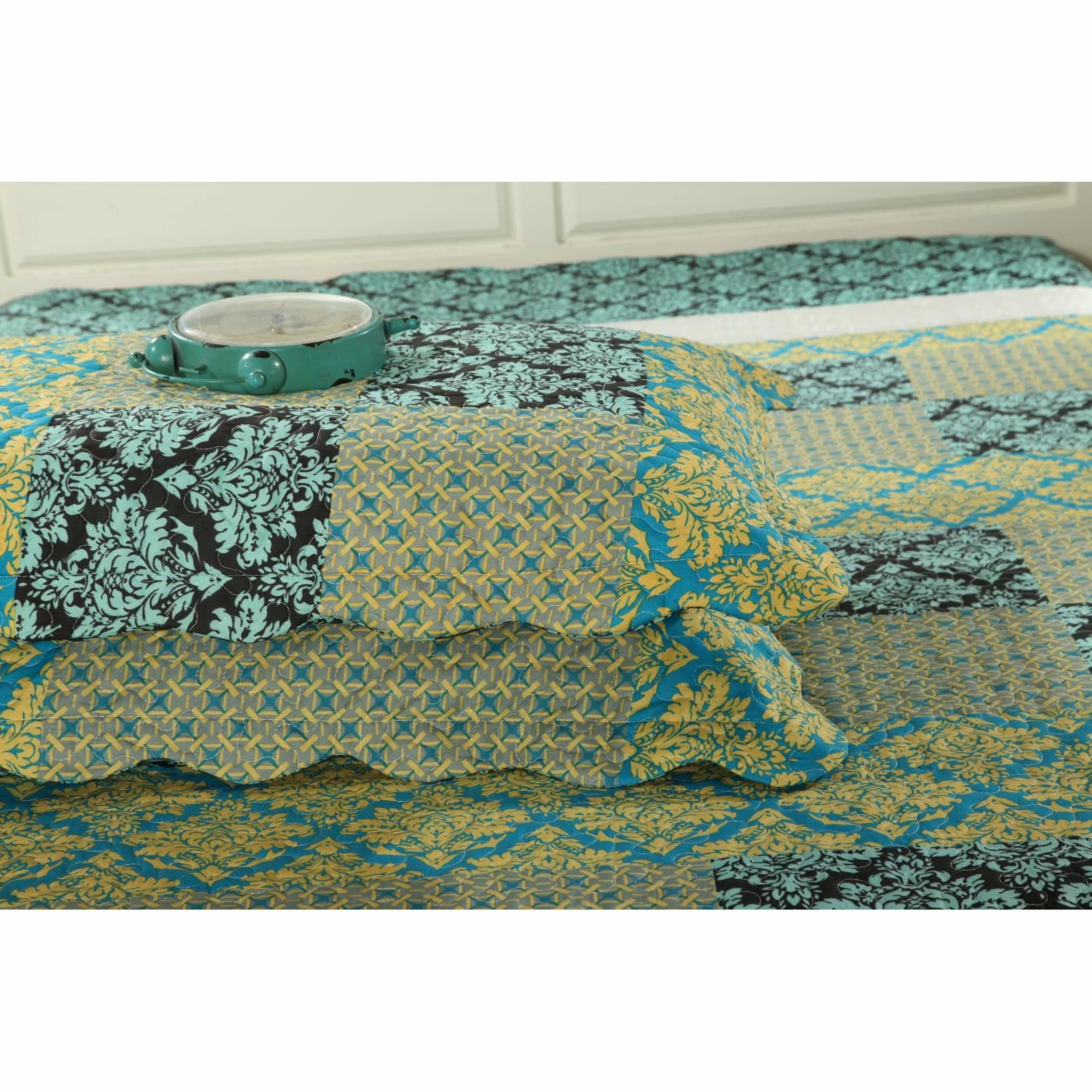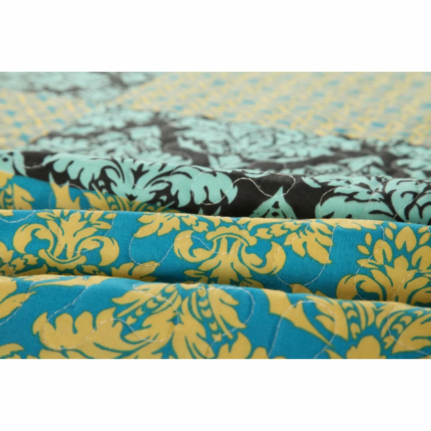 - Blue and yellow patchwork with array of geometric and scrolling prints