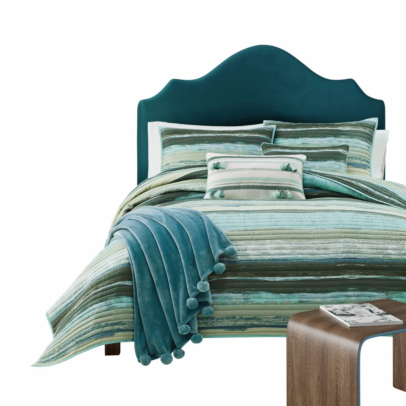 For a cool, artistic feel, make your bed with the Cameron Forest Coverlet by Five Queens Court. Delight in its turquoise, forest green, and teal watercolor stripes, turquoise piping trim, and channel stitching detail. The coverlet reverses to a coordinating solid and matches the Cameron Forest bedding set. Choose from available sizes.