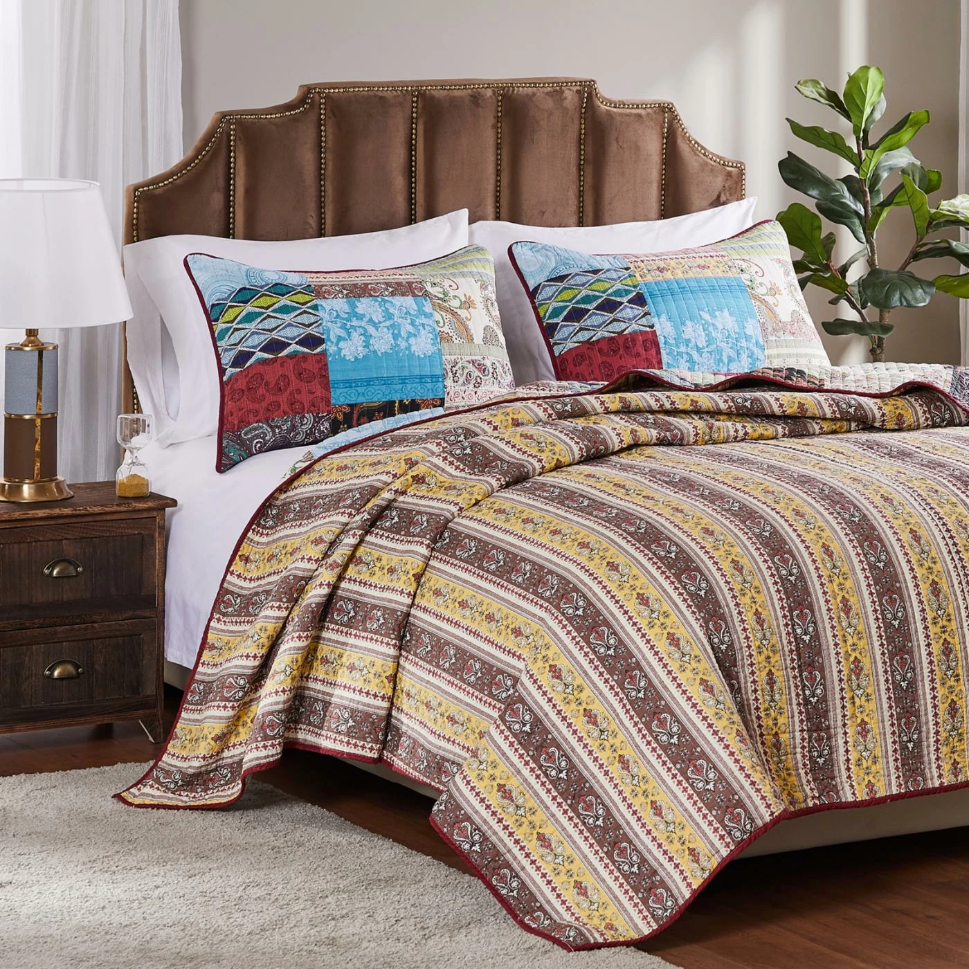 Build a comfortable Boho chic retreat in your bedroom with this Bohemian Dream Quilt Set by Greenland Home. This quilt set is a mix of colorful contemporary and retro fabrics with authentic patchwork styling and distinctive channel stitching. It reverses to a coordinating decorative stripe. The quilt is oversized to accommodate today’s deeper mattresses. Bedding is made of prewashed and preshrunk 100% cotton that’s machine washable and ultra soft. This set includes the reversible quilt and two pillow shams (one with twin size).