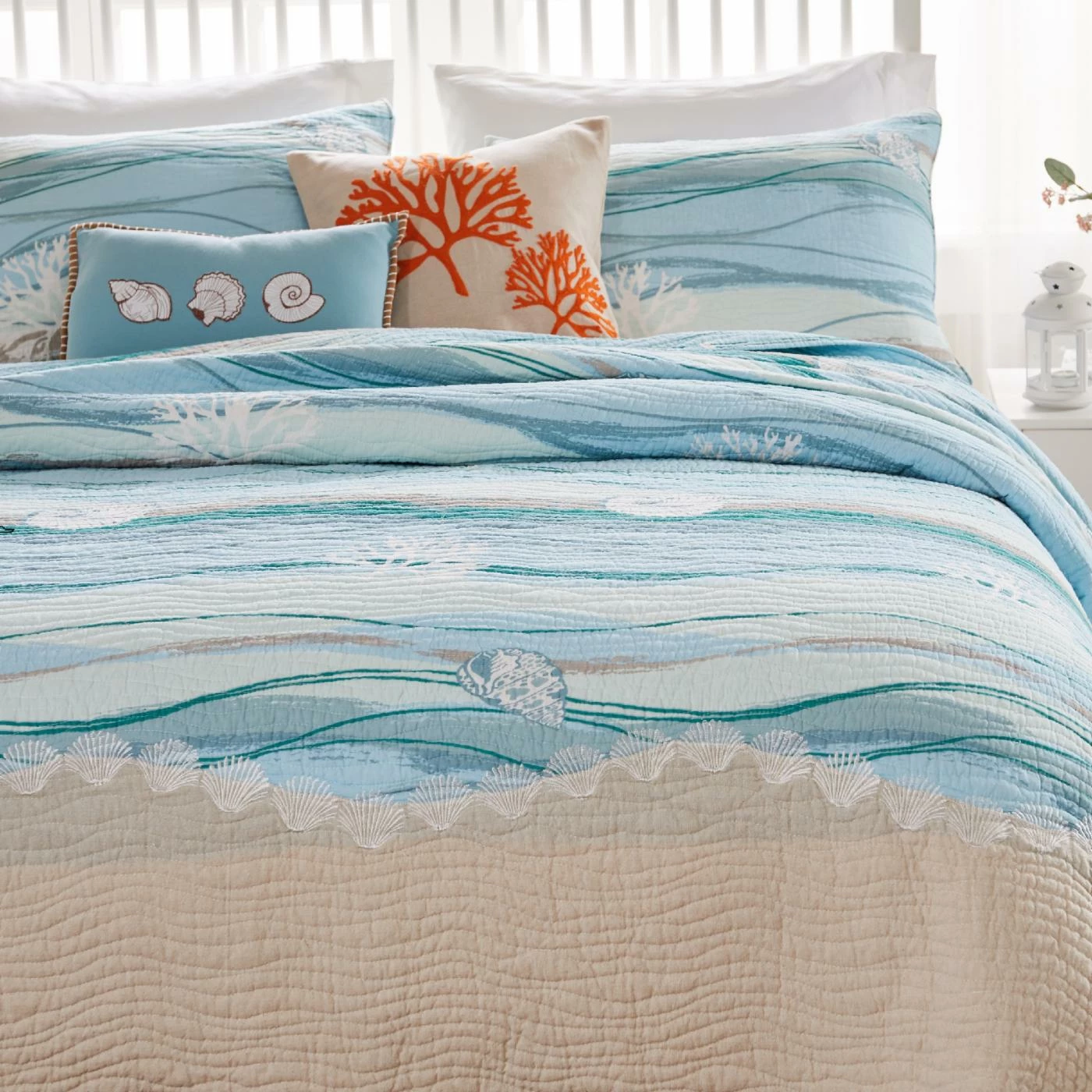 Get swept away by a beachy breeze with our Greenland Maui Bonus Quilt Set. The quilt features a sand border with waves and embroidered shells, corals, and birds. Quilt reverses to an all-over wave print. Bonus decorative pillows feature durable canvas covers, zipper closers, and decorative embroidery, applique, and bordering. Machine quilted for durability and oversized for better coverage on today’s deeper mattresses.