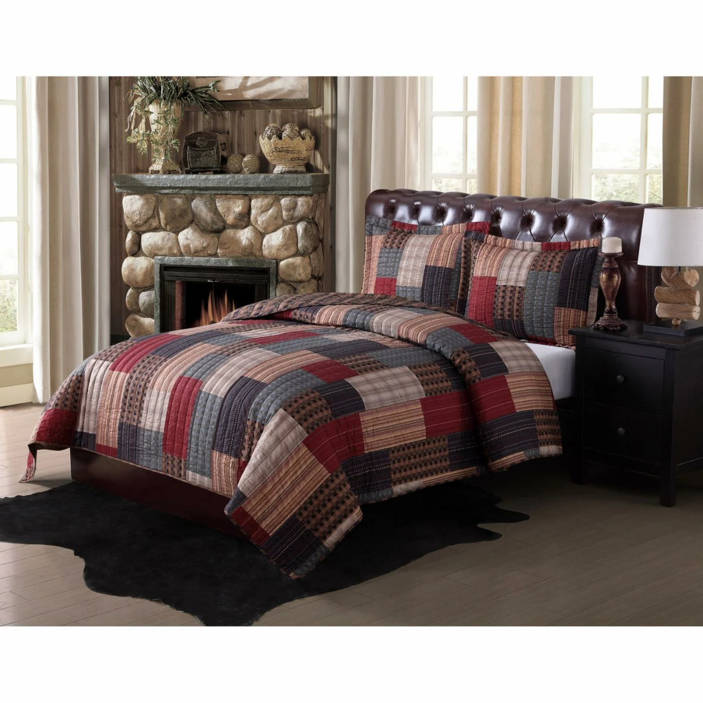 For a cozy, lodge-inspired bedroom, make your bed with the Gunnison King Quilt Set by Remington. Its patchwork of plaids and patterns comes in a rich red, blue, and tan palette. The quilt reverses to a coordinating brown and black check. This bedding set includes the homey quilt and two pillow shams with flange trim. Pieces are made of quilted natural cotton and are machine washable. Choose from available size options.