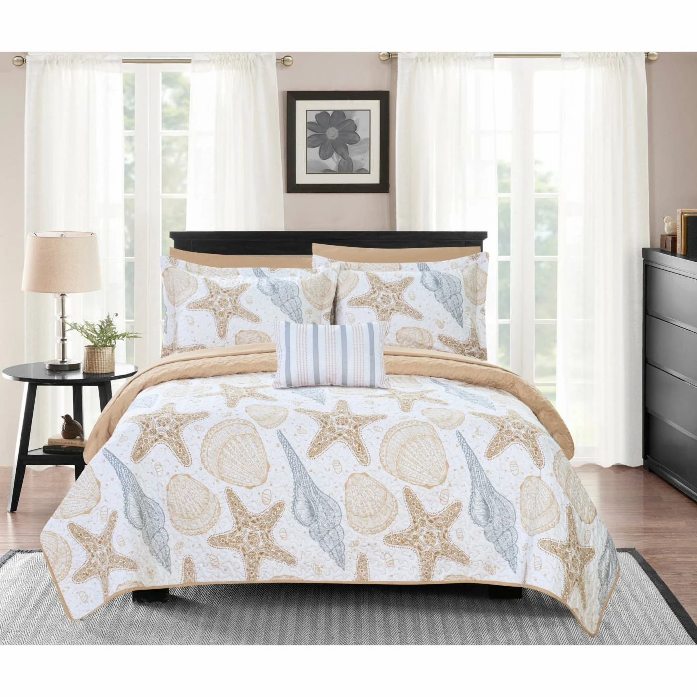 TheΒ Bastille Quilt Set Bed in a Bag by Chic Home includes everything you need to get your bed set up for lasting comfort. This quilt set features a seashell pattern for beach-inspired relaxation. Included is a quilt, coordinating sheets, pillowcases, shams, and a decorative throw pillow. Everything is constructed of soft microfiber fabric and the quilt has hypoallergenic fill. This set is machine washable. Enjoy your choice of available size options.