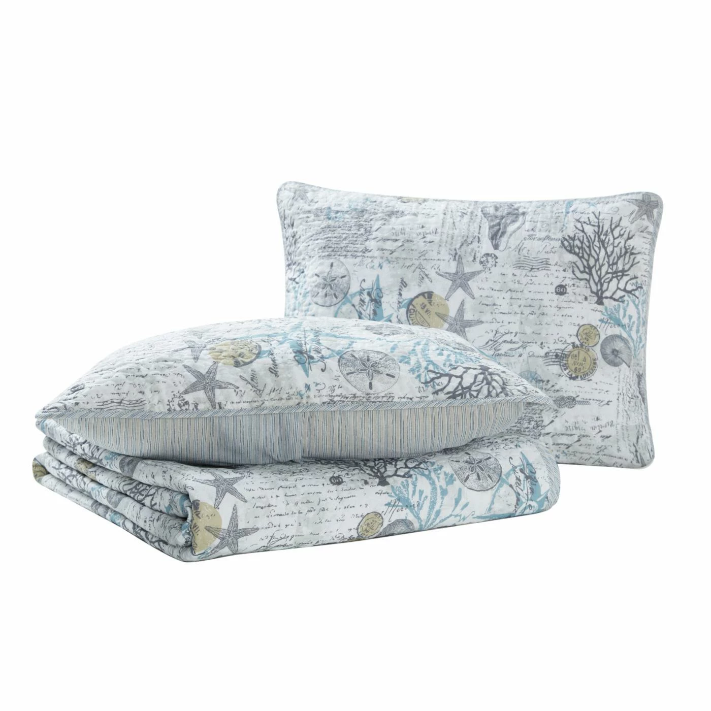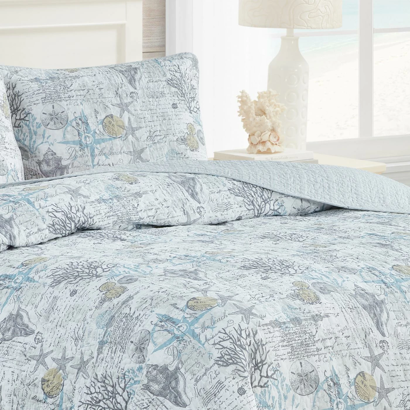 Make your bedroom a beach house suite with the Beach Bliss Quilt Set by Tommy Bahama. Settle in under sumptuously soft, prewashed cotton and dream of sweet summer days and seaside vacations. This quilt set boasts detailed drawings of shells and coral with antique calligraphy in a sophisticated palette of gray and white.