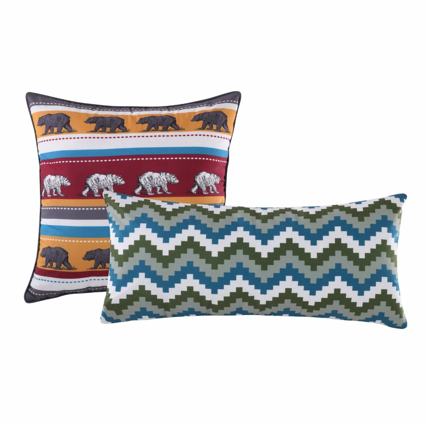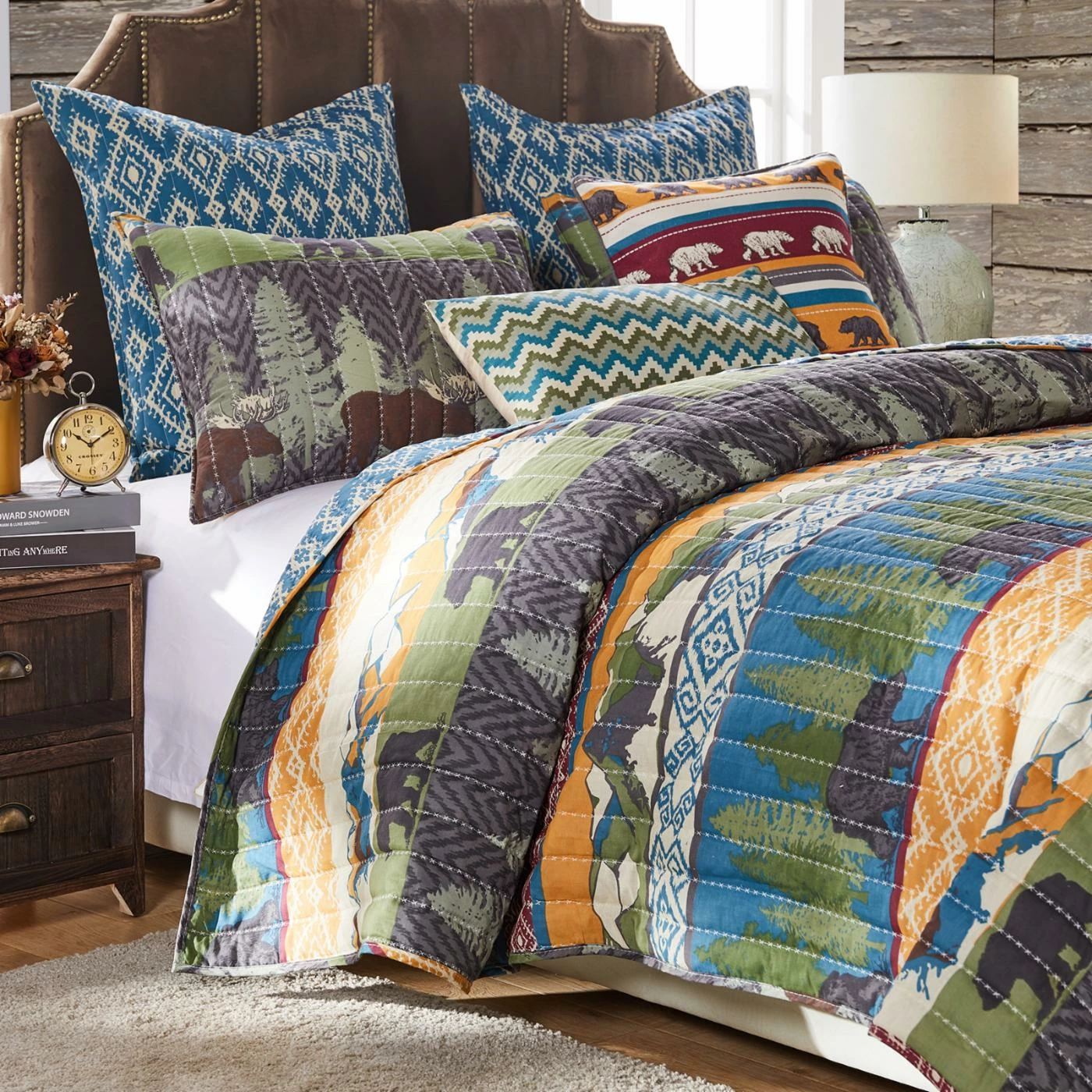 Bring a rustic lodge vibe into the bedroom by dressing your bed in the Black Bear Lodge Quilt Set by Greenland Home Fashions. The printed lodge pattern with black bears, forests, and rich, earthy colors reverses to a surprisingly contemporary blue and white Ikat diamond. This bedding set includes the reversible quilt, two pillow shams (one with twin size), and three decorative pillows. Covers are machine-washable, but remember to spot clean the pillow inserts. Choose from available sizes.