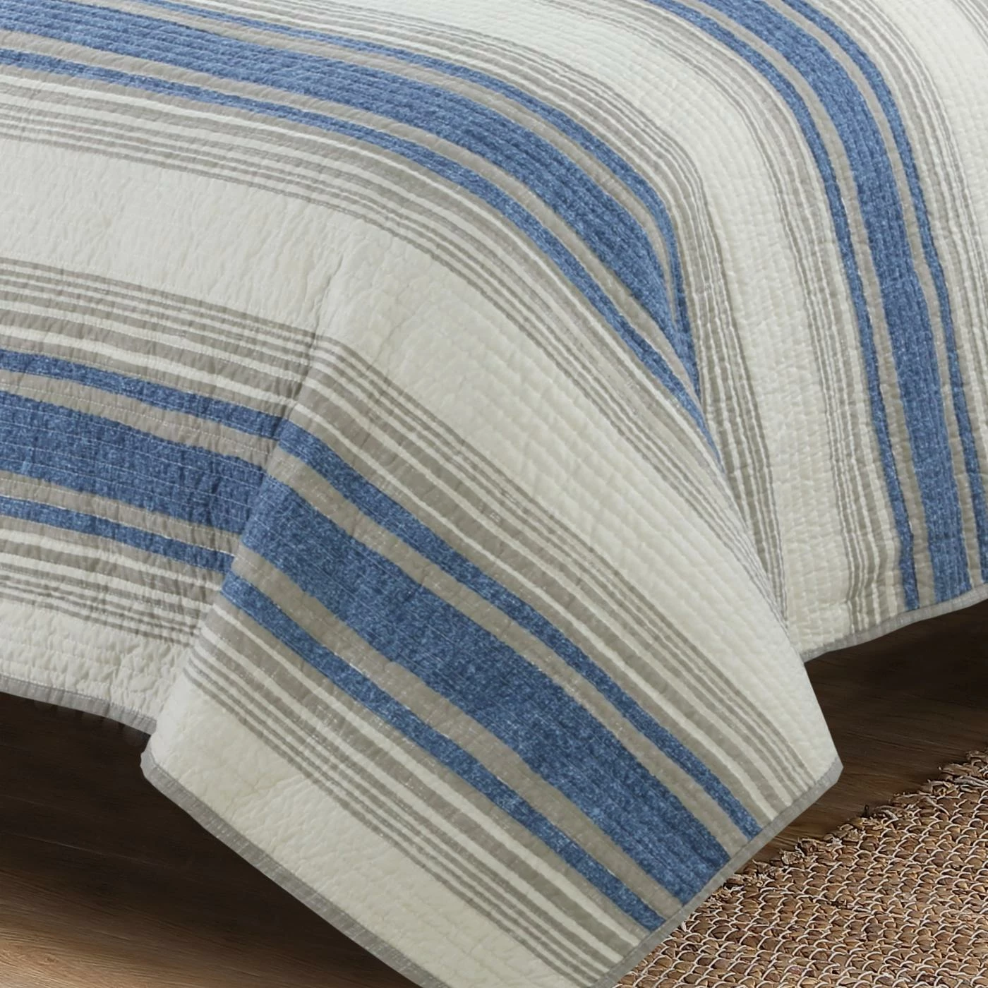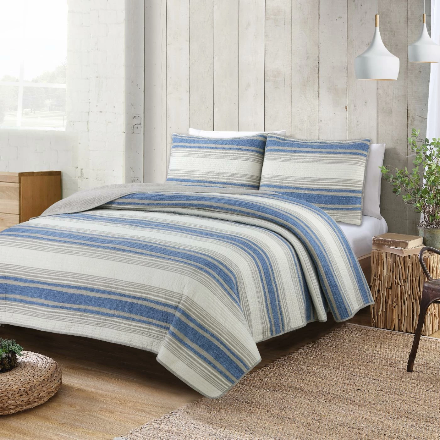 The Bolivar Reversible Quilt Set by Estate Collection showcases a ticking stripe in shades of blue and taupes. This beautiful stripe print reverses to a subtle, textured print in taupe. Machine washable.