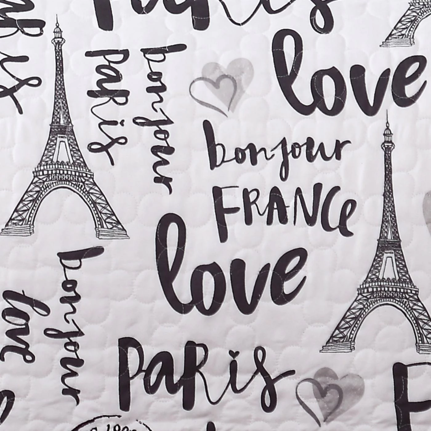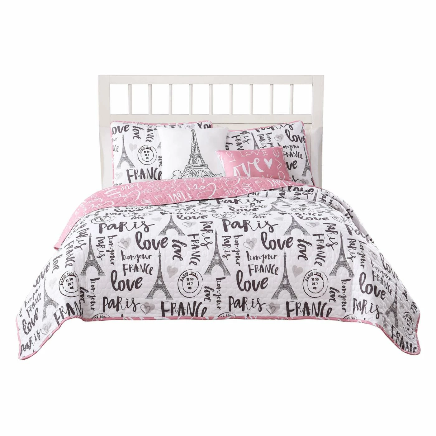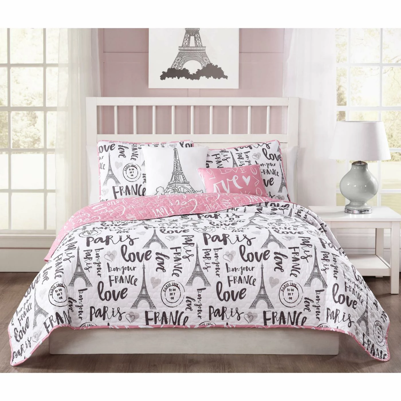Express your love of traveling by featuring the Bonjour 5 Piece Reversible Quilt Set by Creative Home Ideas in your bedroom or dorm room. The reversible quilt showcases two eye-catching prints in a black, white, and pink color scheme. Included pillow shams and decorative pillows complete the design. For ease of care, each piece in this quilt set is crafted from a soft blend of machine-washable cotton and polyester fabric.
