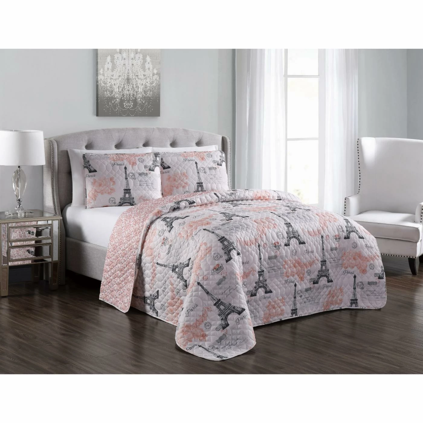 Make your bed tres chic with the Brigette Quilt Set by Blush. Eiffel Towers, blush pink flowers, and a vintage postal print reverse to a pink and white tile medallion for two looks in one. The reversible quilt and two matching pillow shams (one with twin size) are included. Pieces are made of soft microfiber polyester with cotton batting and are conveniently machine washable. Choose from available size options.
