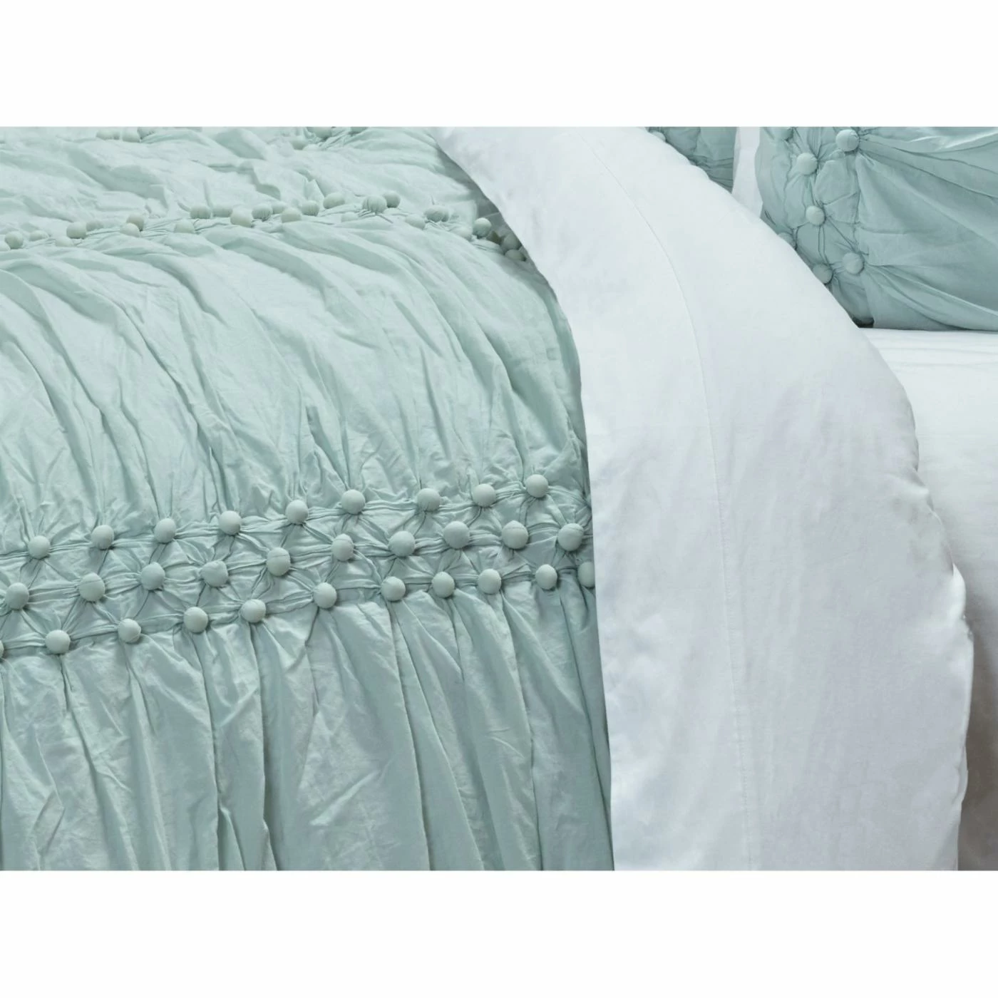 Featuring a soft cotton cover and polyester batting, this Chelsea Cane Quilt by Rizzy Home is a luxurious add-on to your bedding set. Vertical rows of cotton-filled pom pom hand secured accents give this machine washable quilt plush elegance. A soothing salt blue color ensures it will coordinate with a variety of different dรฉcor types. Offered in multiple size options.