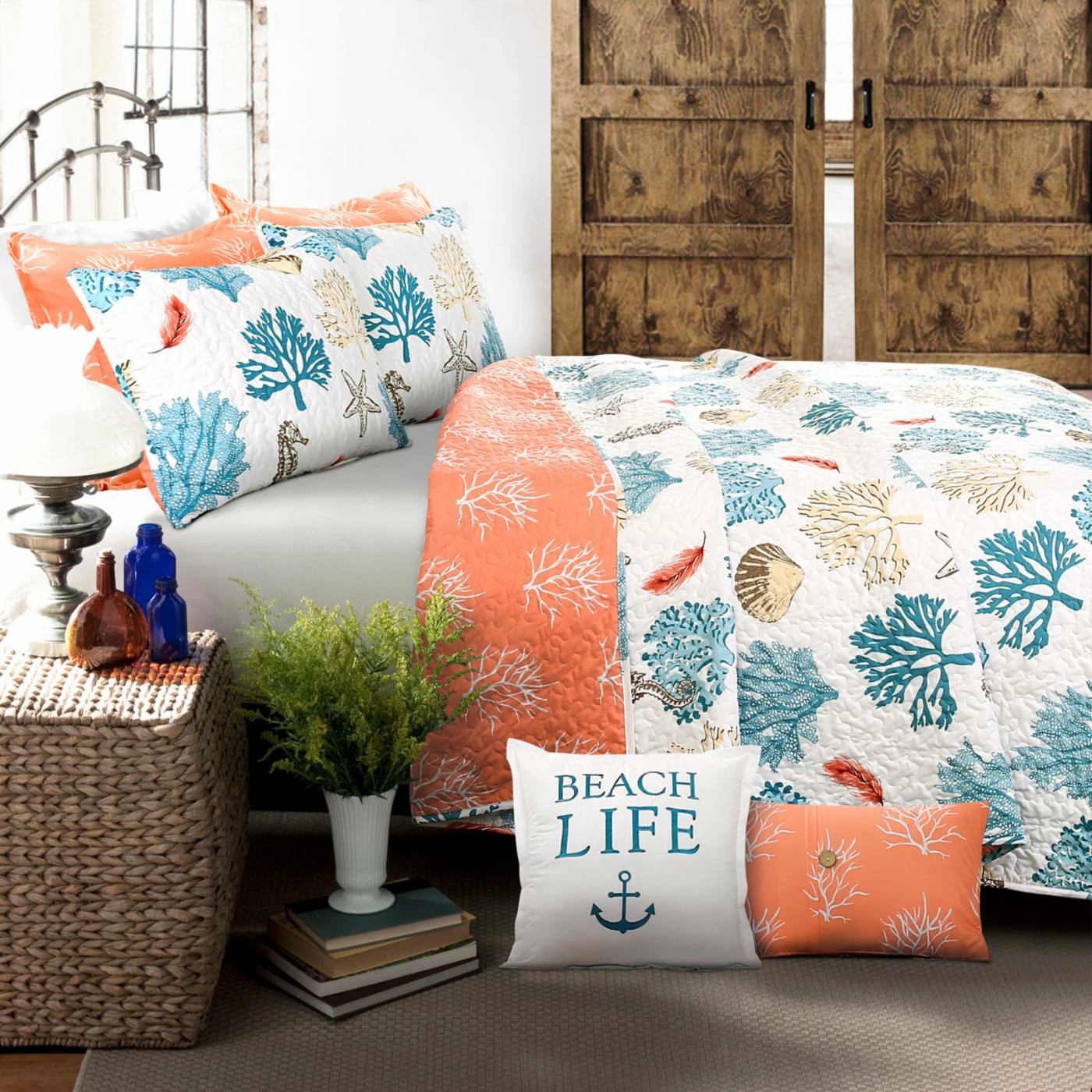Foster a beachy feel in your bedroom any time of year with the Coastal Reef 7 Piece Feather Quilt Set by Lush Decor. This bedding set features bright, contrasting turquoise and coral orange hues against a crisp white ground. Sea-inspired imagery swims across the quilt, pillowcases, and shams. Detailed illustrated seahorses, starfish, coral, shells, and feathers combine to infuse your bedroom with coastal style. The quilt reverses to a bright coral color that matches the accompanying shams and one of the two decorative throw pillows. The other decorative pillow features a bright white background with an anchor and the words, ‘beach life’ depicted in a rich teal, broadcasting your love of life by the sea.