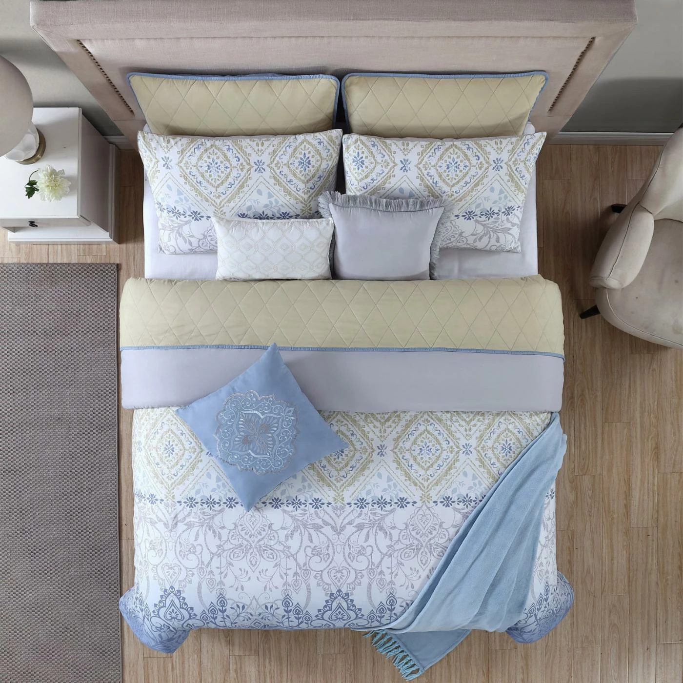 - Includes comforter, quilted coverlet, and 4 shams