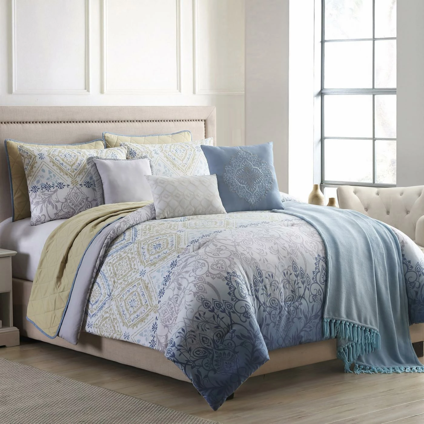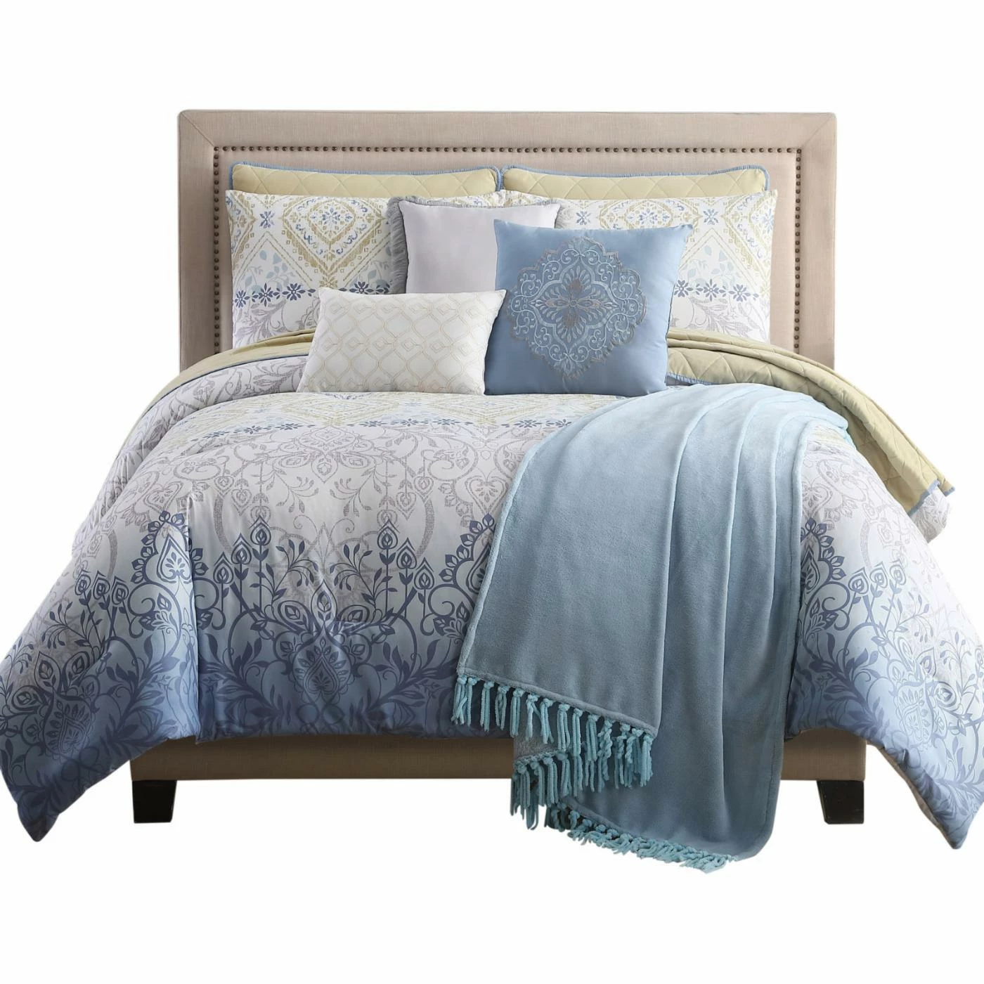 A subtle ombre design flows across the unique patterns on the Dresden 10 Piece Reversible Comforter Set with Coverlet by Pacific Coast Textiles. Gold, blue, gray, and white dance around the damask, floral, and diamond designs on the comforter that reverses to a solid gray. This set includes the comforter with two coordinating shams and two decorative pillows. The included reversible coverlet set works well on its own, but it will also coordinate well with the comforter set. The quilted coverlet set has two coordinating shams and one decorative pillow. Each machine-washable piece in the set is constructed with a microfiber cover and polyester fill. Complete the look with the included blue flannel throw with tassel edges. Choose from the available size options to find the best fit for your bed.