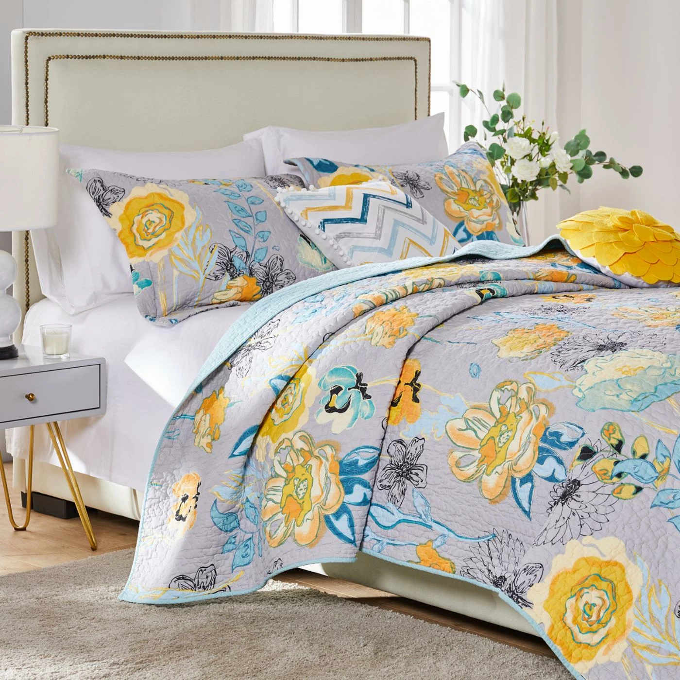 Cheer up your sleeping space with the artfully chic Watercolor Dream quilt set. Sprouts of color bloom beside stenciled flower illustrations on a gray ground. Quilt reverses to a coordinating solid color for two looks in one.