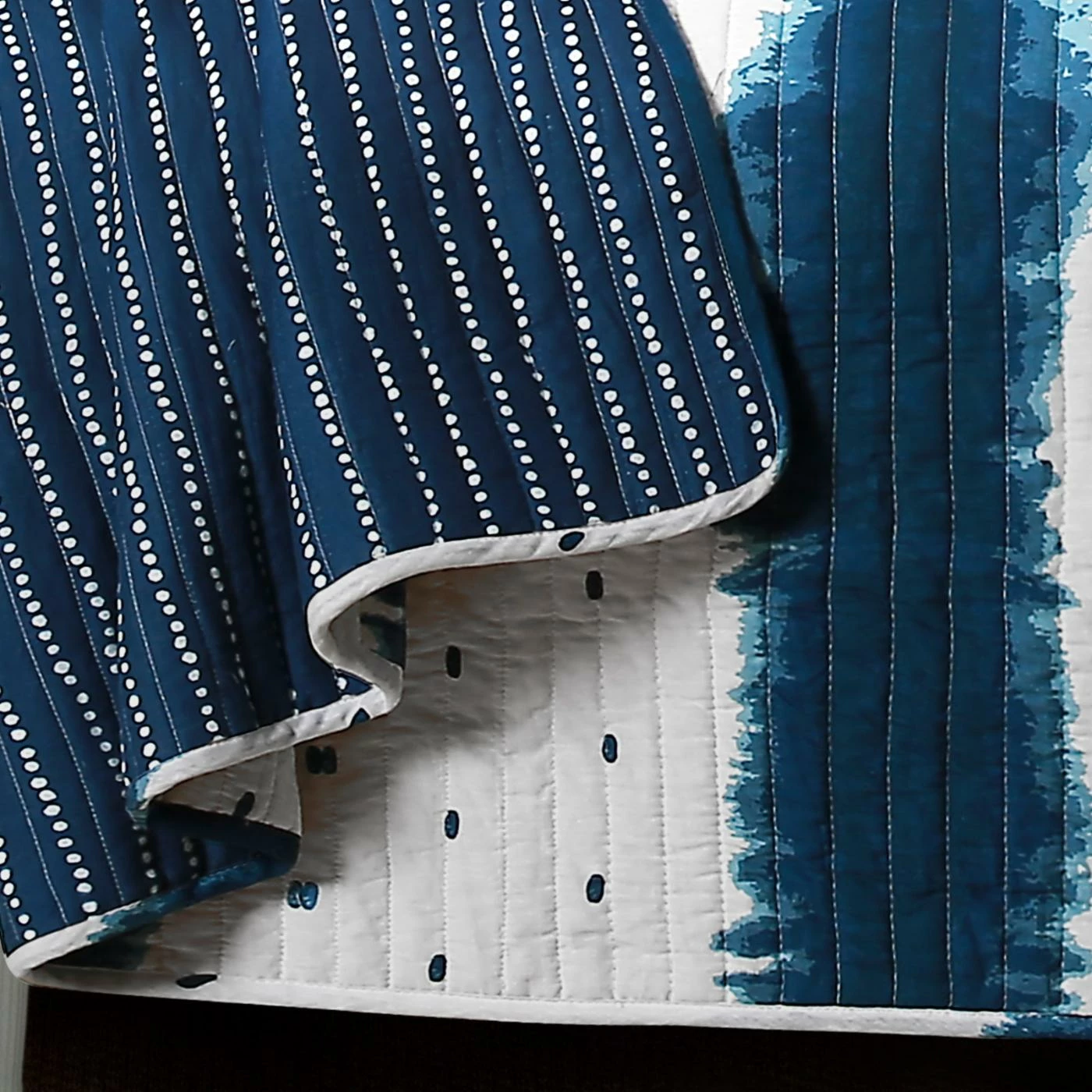 Navy and white stripes plus dots on the Jane Shibori Quilt Set by Lush Decor are inspired by Shibori block print techniques. You’ll love the way this cotton quilt set refreshes your entire bedroom dΓ©cor. It includes the reversible quilt and two matching pillow shams. Choose from the available size options.