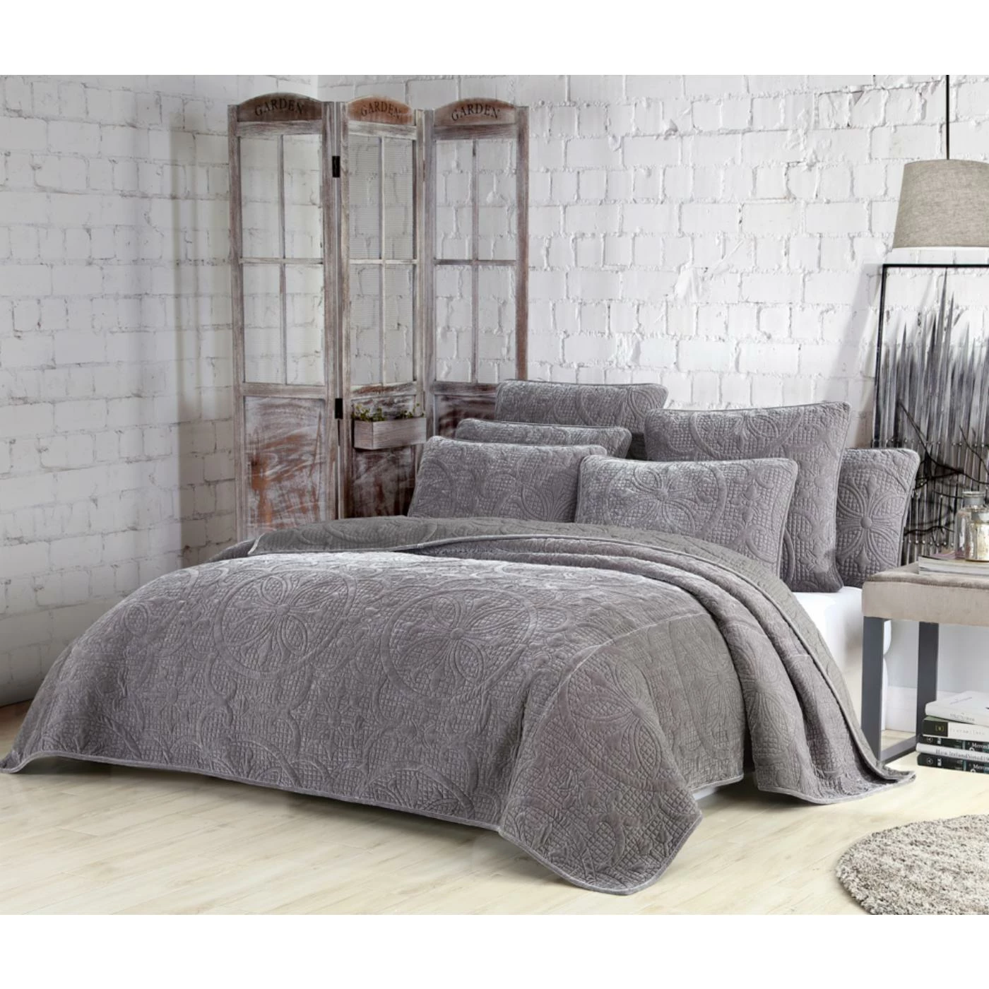 Joanna is a luxurious velvet quilt intricately stitched in a beautiful medallion pattern. This super soft quilt adds warmth, style and sophistication to any master bedroom. The quilt reverses to a subtle texture print. Quilt dimensions are Full/Queen 88″x92″ and King 106″x92″. Set includes quilt and two shams. 100% Polyester and machine washable.
