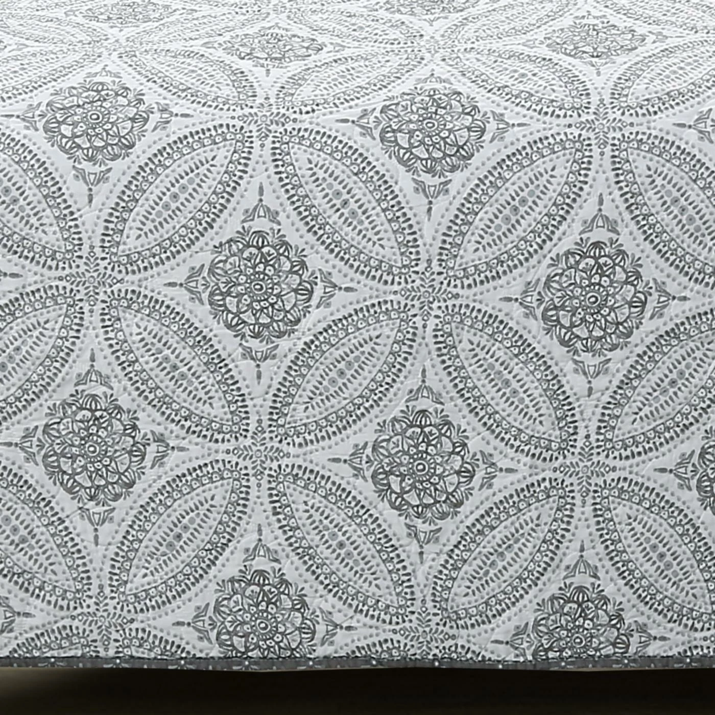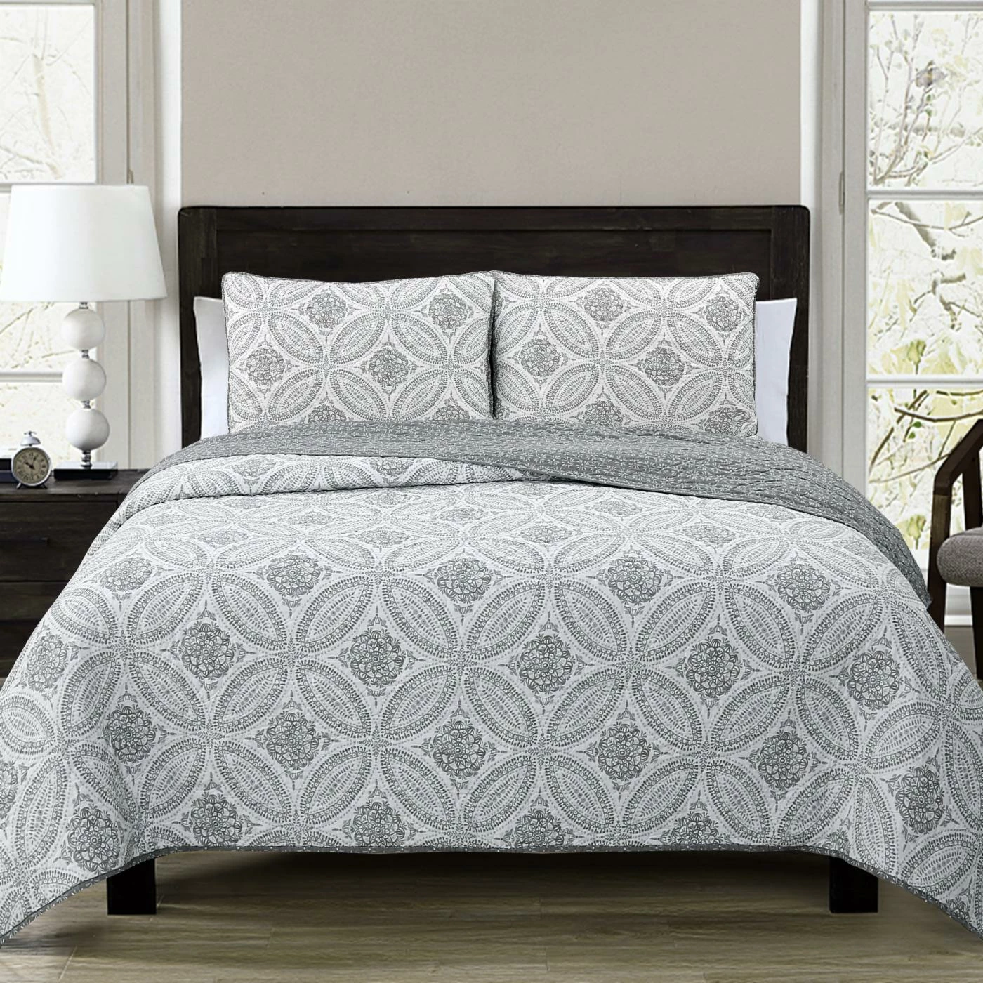 The Kenna bedding set showcases a beautiful watercolor medallion print in shades of grays. It reverses to a small gray foulard pattern to complete the look. This sophisticated look would be beautiful in any master bedroom. Made of 100% Polyester Microfiber, 75 GSM. Fill is 250 GSM, 100% Polyester. Set includes quilt and sham(s). Machine washable. Choose from available sizes.