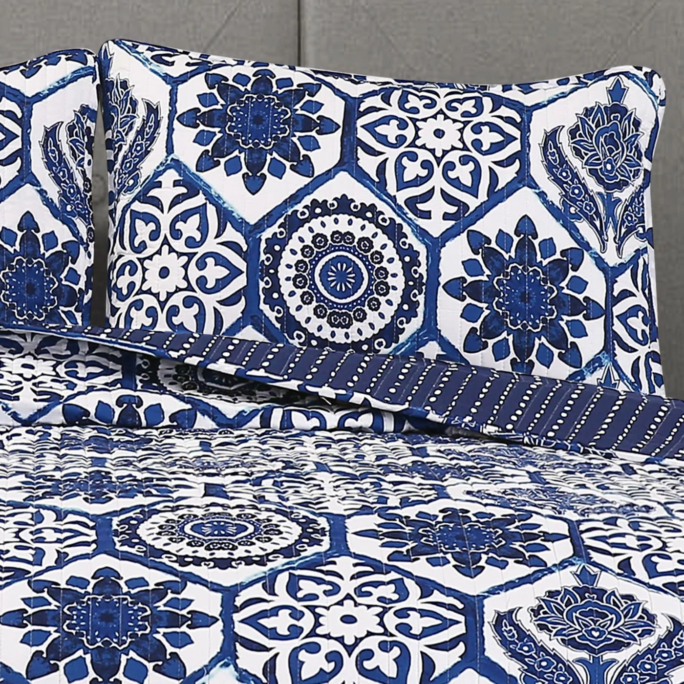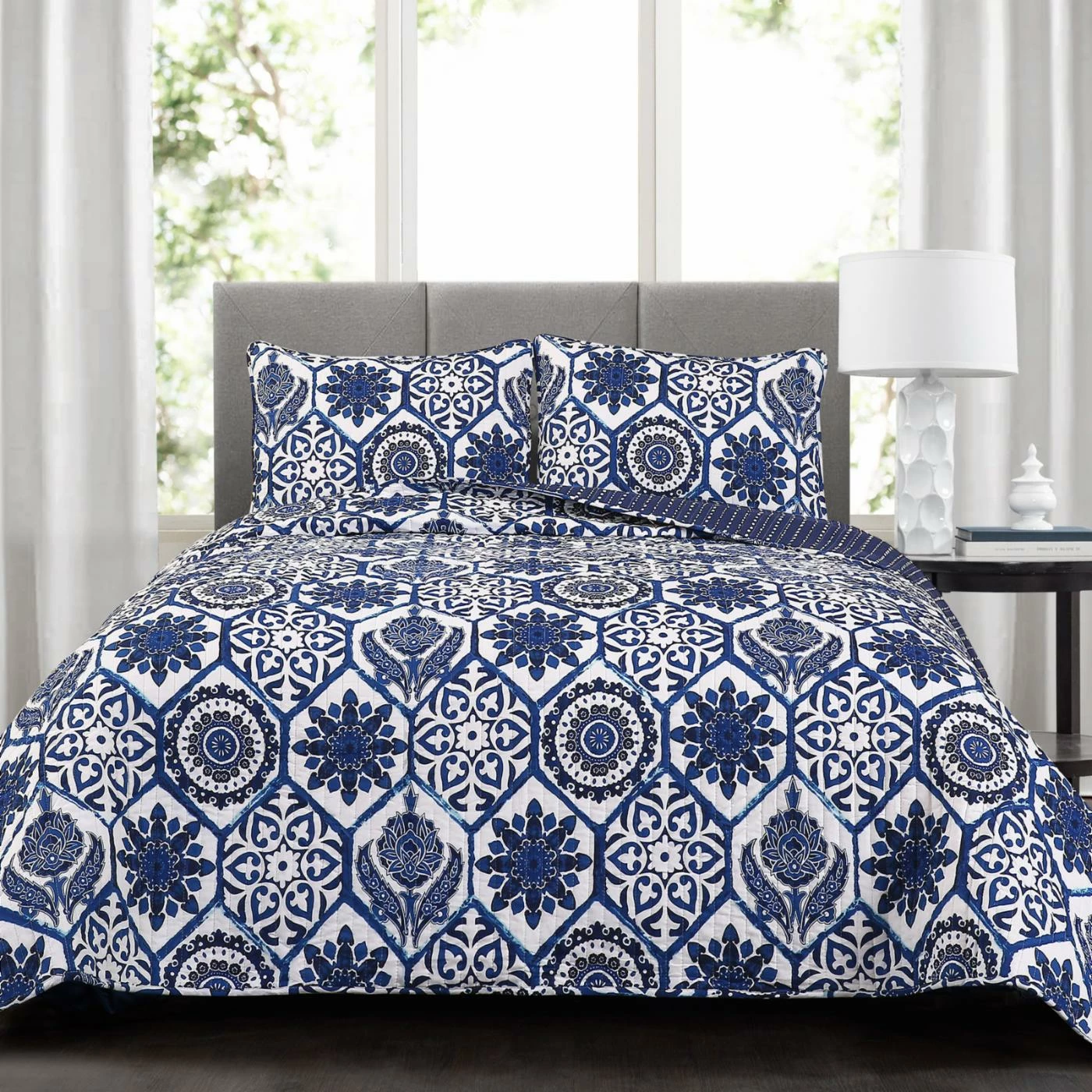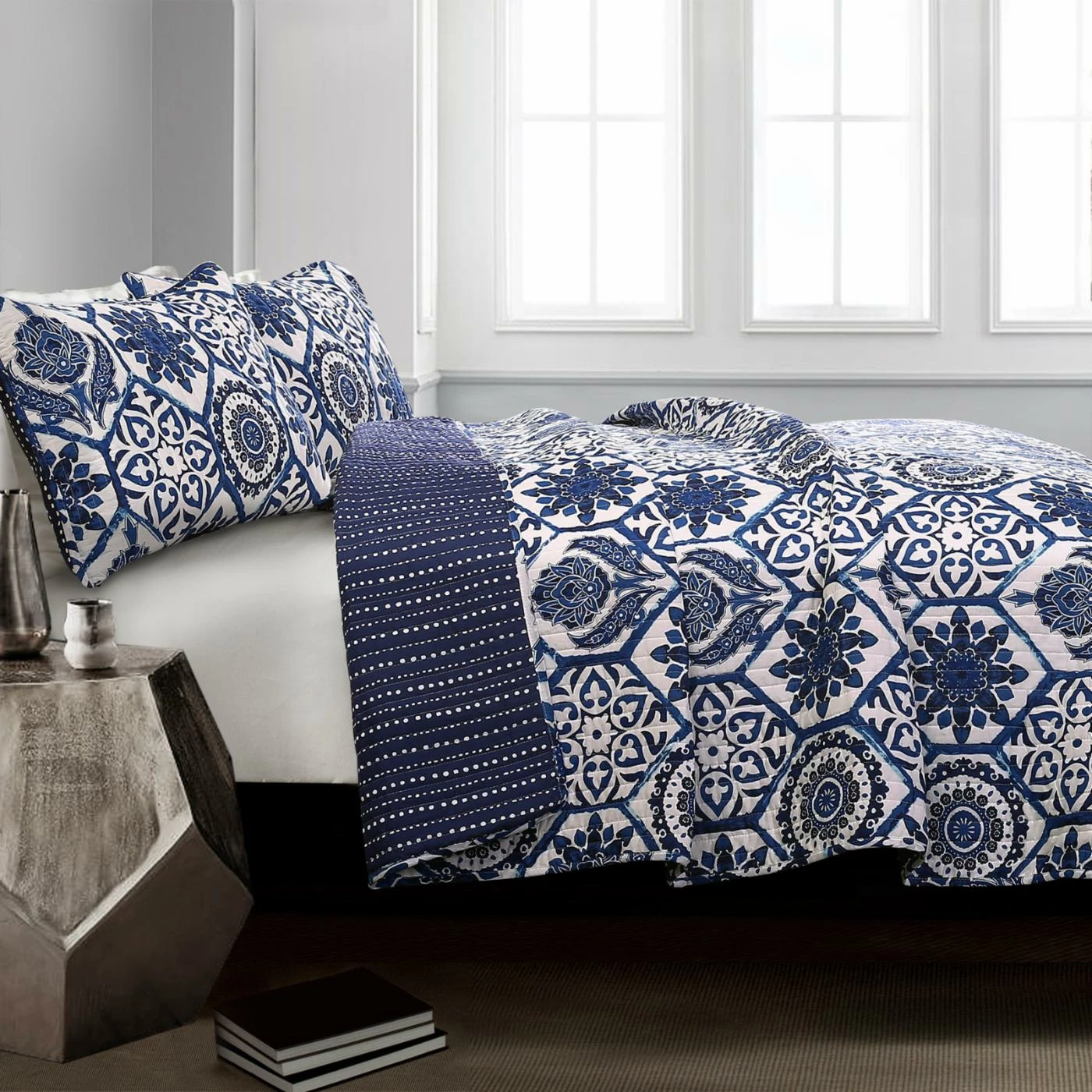 The Marvel Geometric 3 Piece Quilt Set by Lush Decor is a bold addition to any bedroom. Its blue and white print is inspired by the sea floor and complements most decors. Featuring a reversible design, the flip side of the quilt has a classic blue and white striped pattern. Perfect for snuggling under, this set is made from 100 percent cotton and the quilt has a cotton and polyester fill. It includes a quilt and two shams and is machine washable for your convenience.