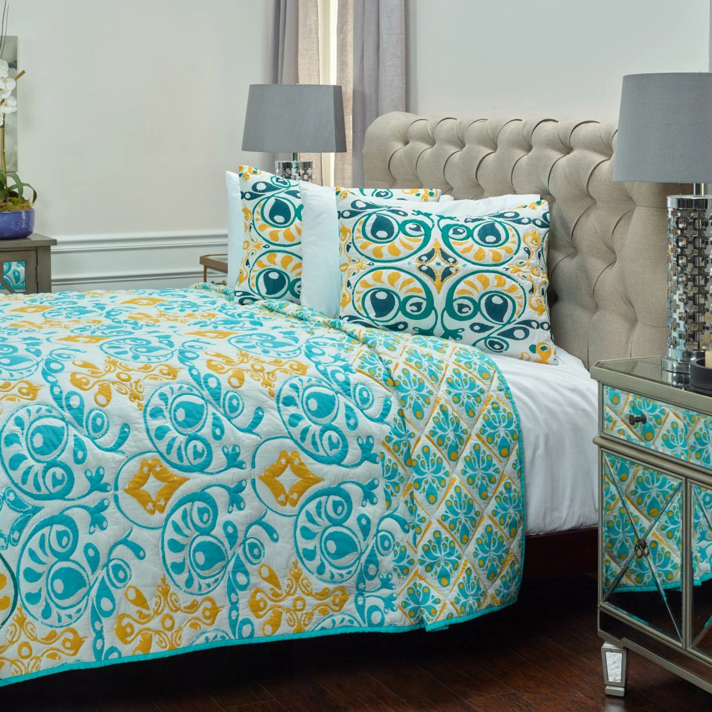 This enchanting Merriweather Quilt by Rizzy Home is cozy, warm, and well constructed. Featuring a cotton voile cover, it’s made of plush polyester filling. Covered in a multicolored floral print, it boasts alluring shades of yellow, aqua, and white. This machine washable quilt is offered in multiple sizes.
