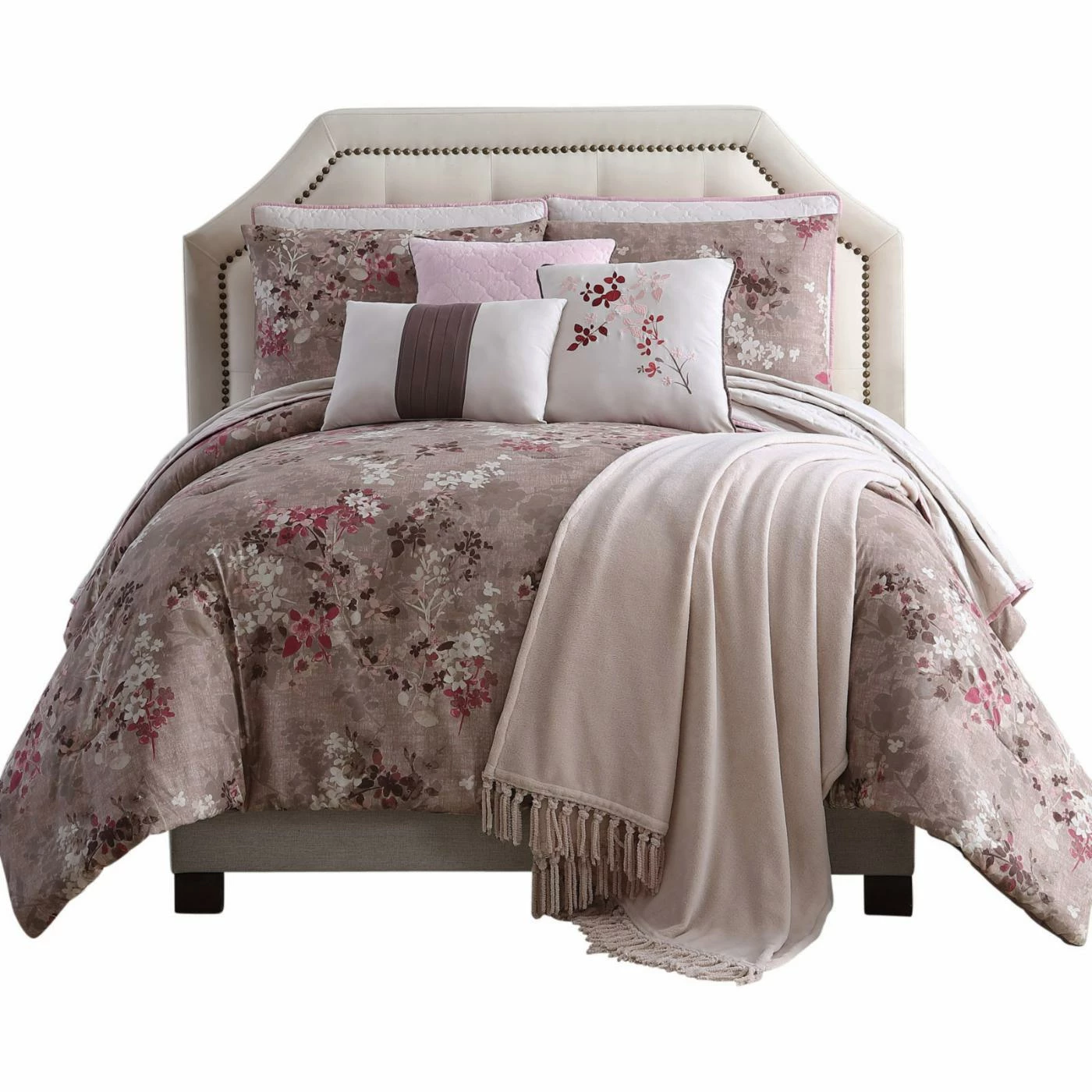 Blossoms will bloom all year long inside your home with the Monet Floral 10 Reversible Comforter Set with Coverlet by Pacific Coast Textiles on your bed. A soft floral design in red, pink, white, and beige sits on a brown background on the comforter that reverse to brown. This set includes the comforter with two coordinating shams and two decorative pillows. This comforter set also comes with a coordinating reversible coverlet set that you can use with the comforter or on its own. The quilted coverlet set has two coordinating shams and one decorative pillow. Each machine-washable piece in the set is constructed with a microfiber cover and polyester fill. Top off your bed with the included beige flannel throw with tassel edges. Choose from the available size options to find the best fit for your bed.