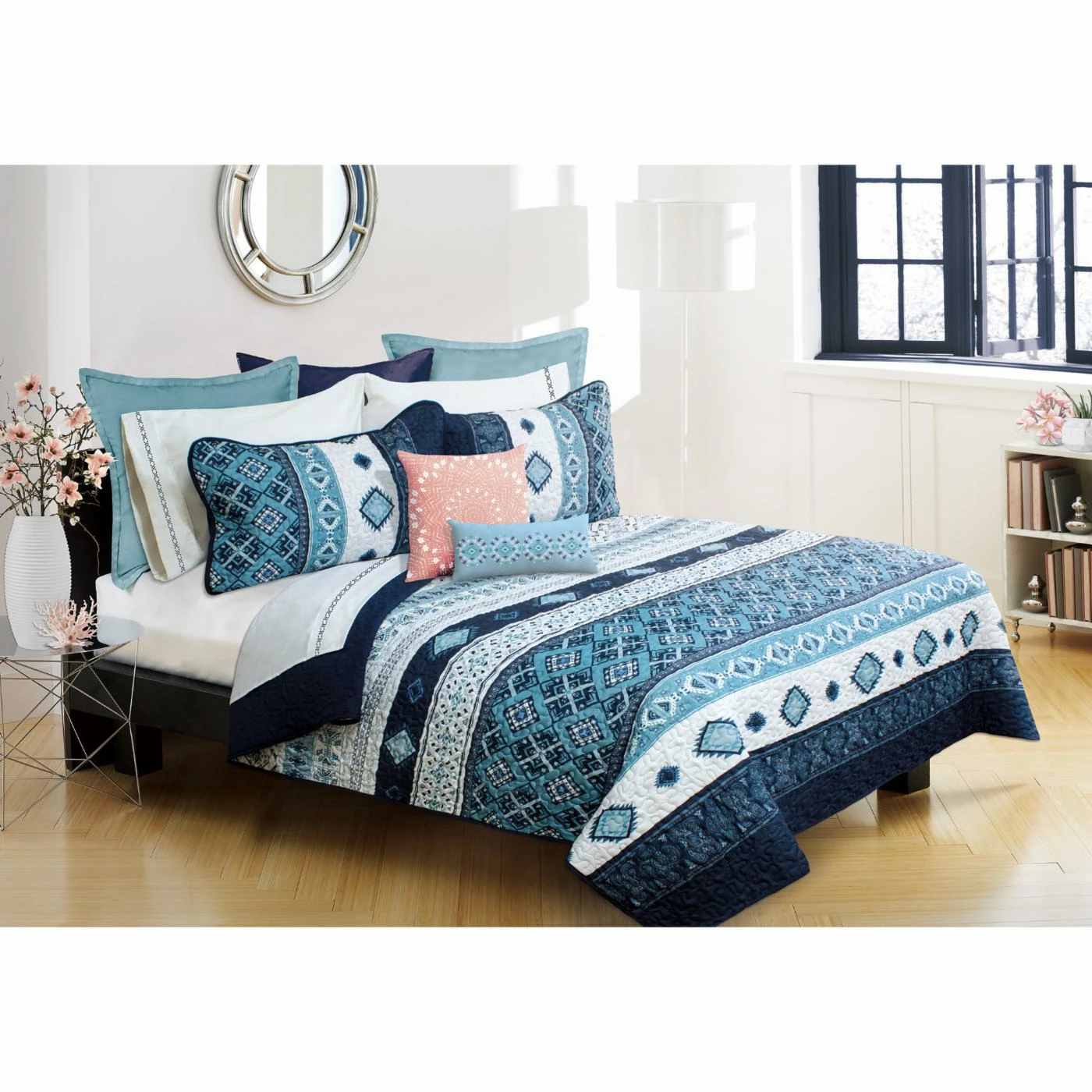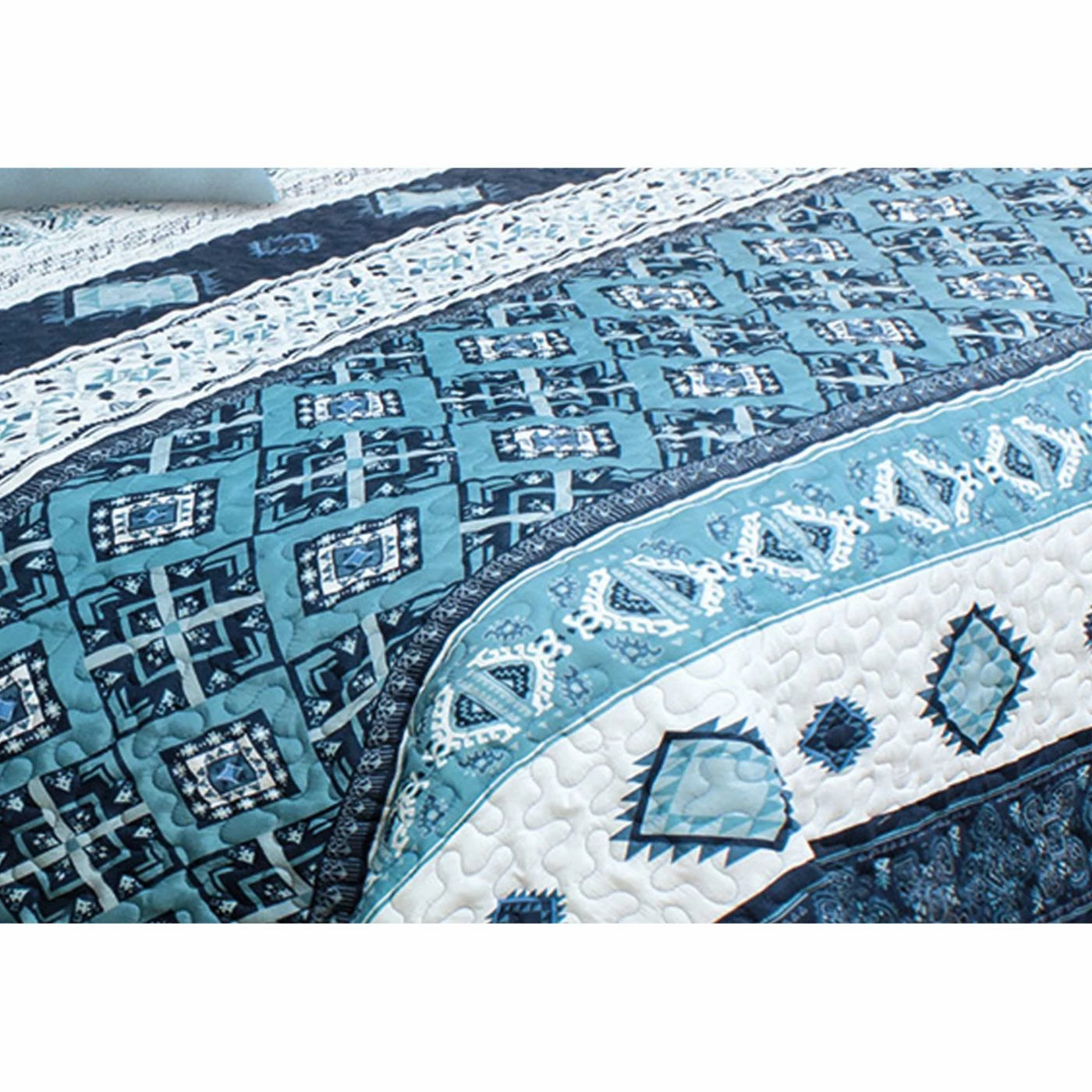 Geometric patterned stripes in shades of blue give the Pacifica Quilt Set by Safdie and Co its bohemian appeal. Microfiber construction makes this quilt soft and machine washable. It includes a reversible quilt and two matching pillow shams (one with the twin size). Choose from available size options.