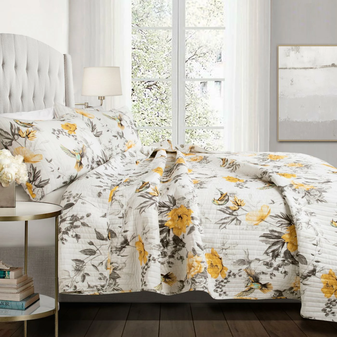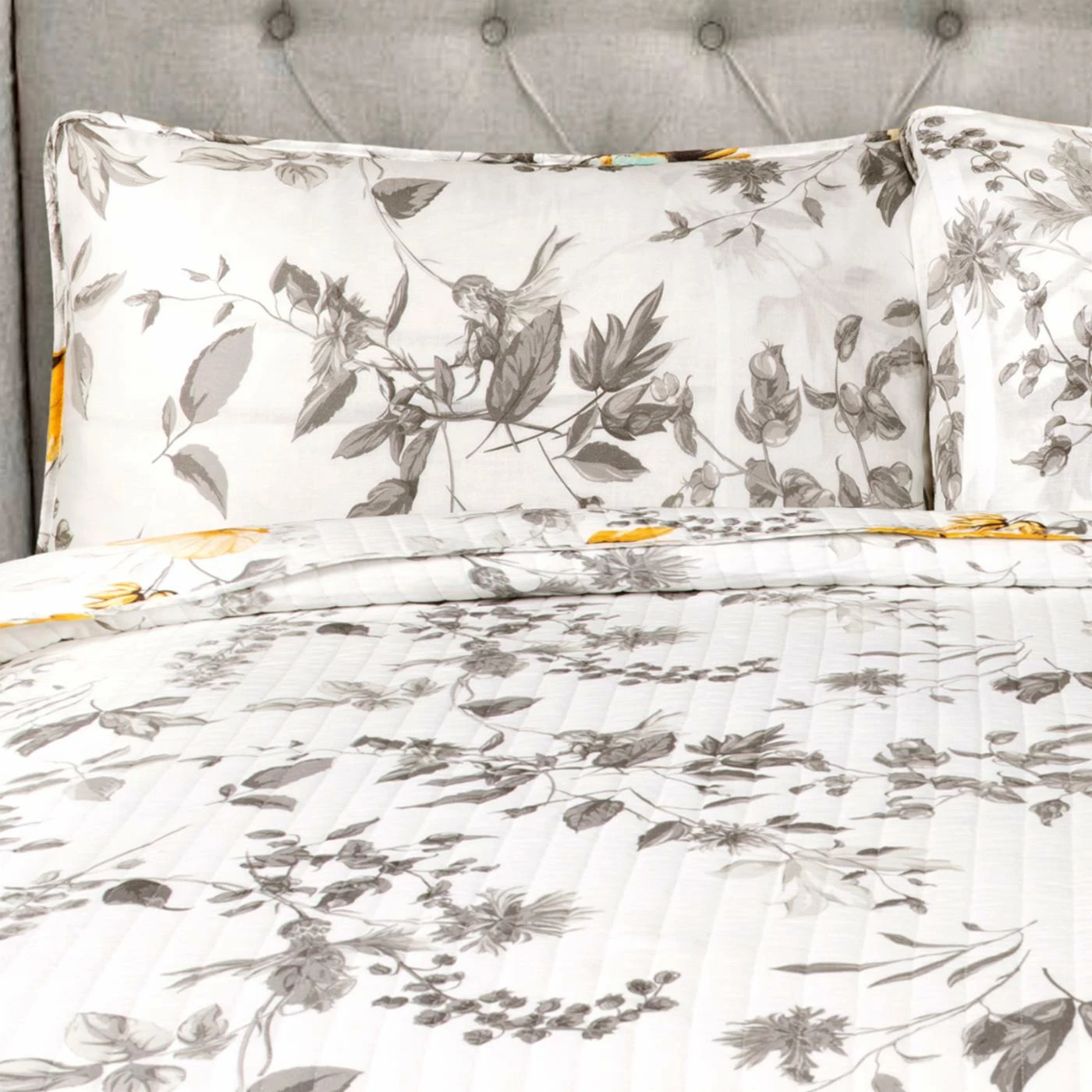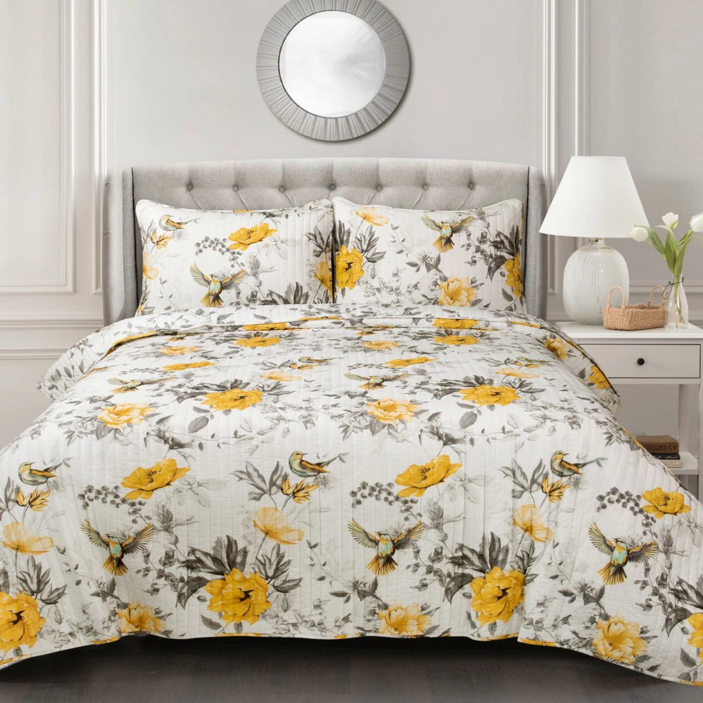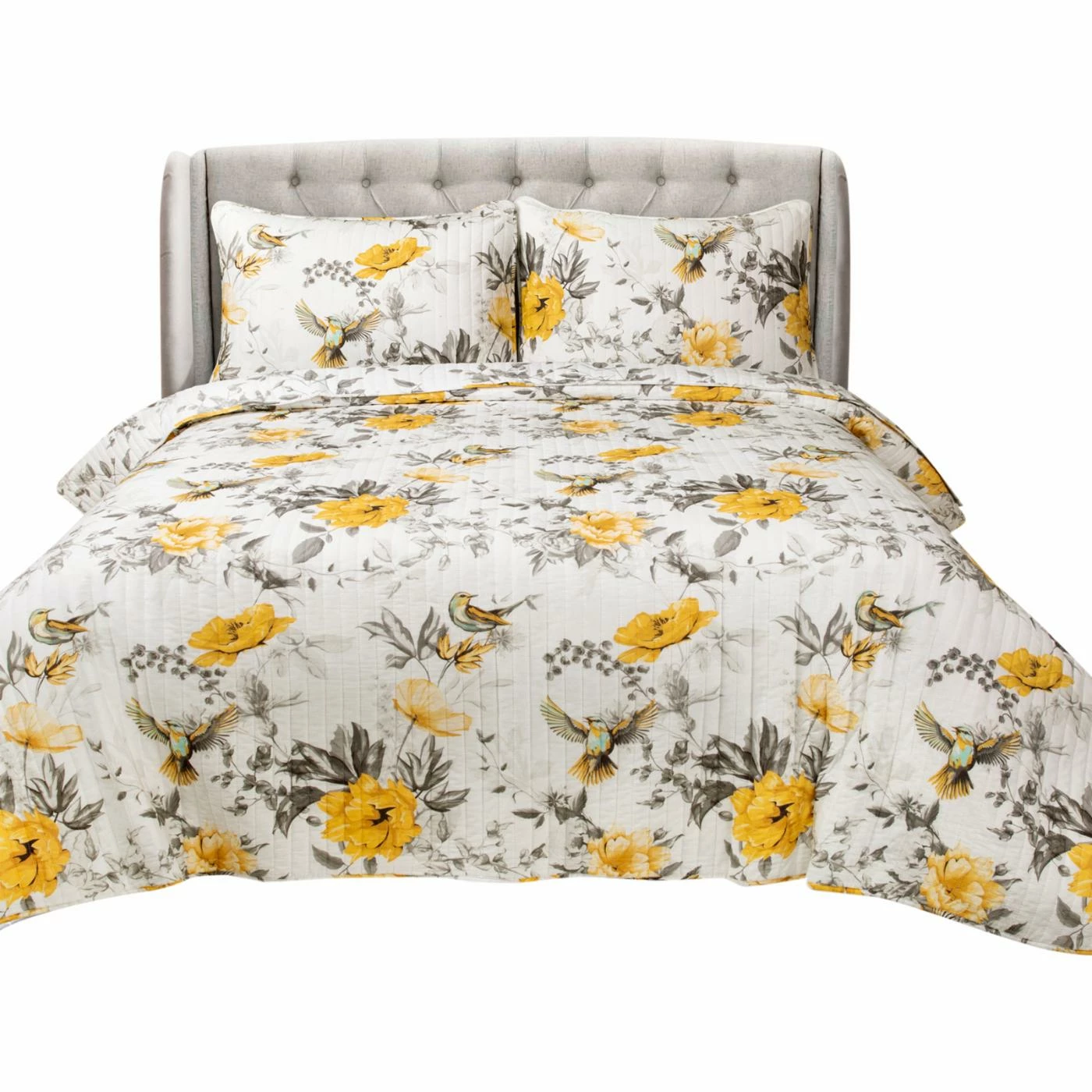 Bring all-season comfort to your bedroom with the Penrose Floral Quilt Set by Lush Decor. The soft cotton fabric features a gray and white botanical print detailed with yellow blooms and birds. It’s also reversible so you can give your room a fresh look any time of year. Vertical stitching and clean edges give this set a contemporary yet inviting charm. Your choice of available sizes promises a perfect fit in your home.