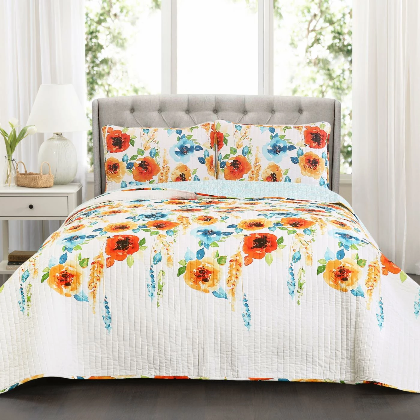 Achieve a vibrant and sophisticated look in your bedroom with the Percy Bloom 3 Piece Quilt Set by Lush Decor. This simple coordinating collection features a cotton quilt and matching sham set, allowing you to transform your existing bedding into something truly special. The quilt and shams feature a stark white ground decorated with rich watercolor flowers, imbuing your bedroom with an impressionistic style. The vertical stitching on the quilt against the open, white background makes it look as if your bed is decorated in cascading flowers. The quilt reverses to a delicate light blue scalloped print, adding a further artistic note to this brilliant set.