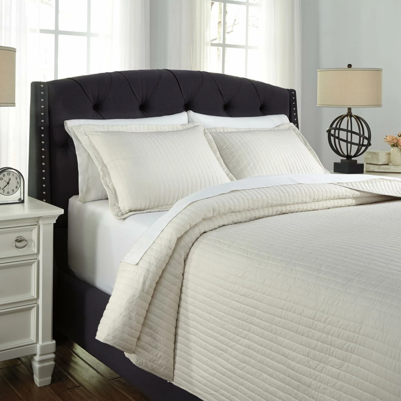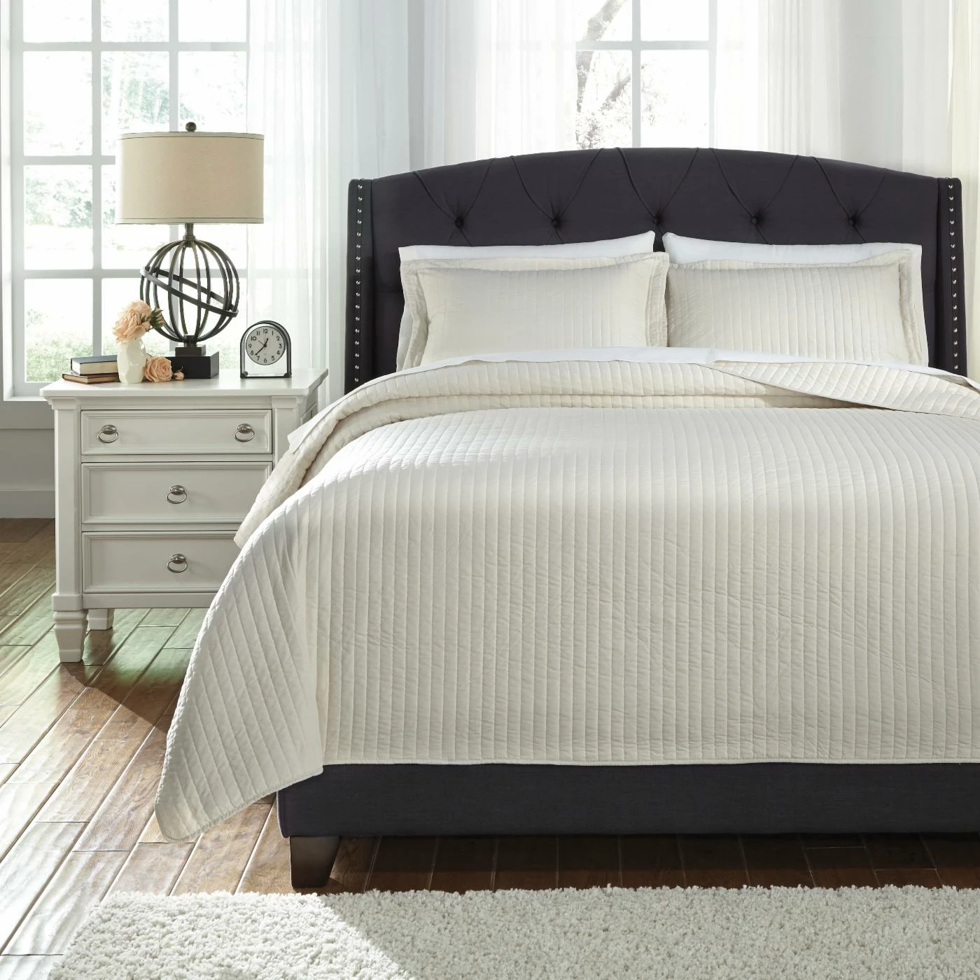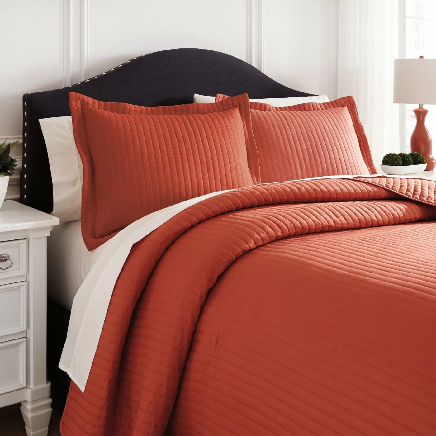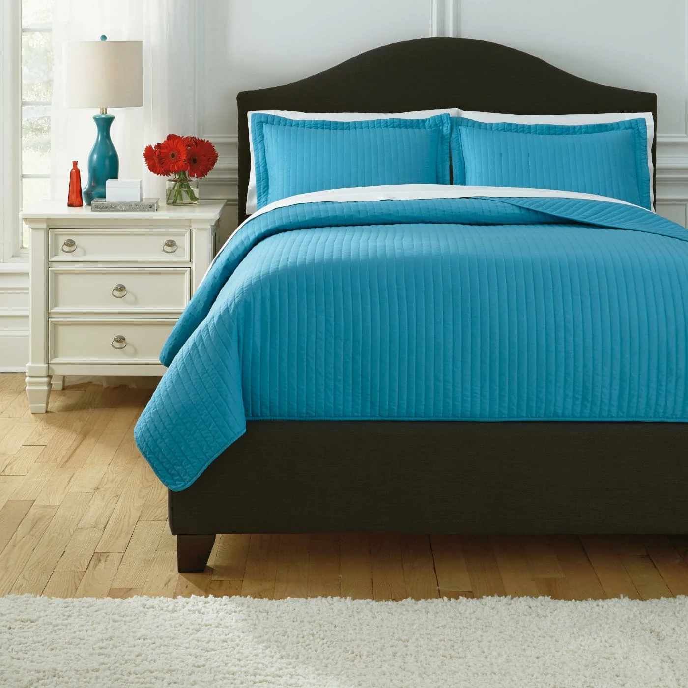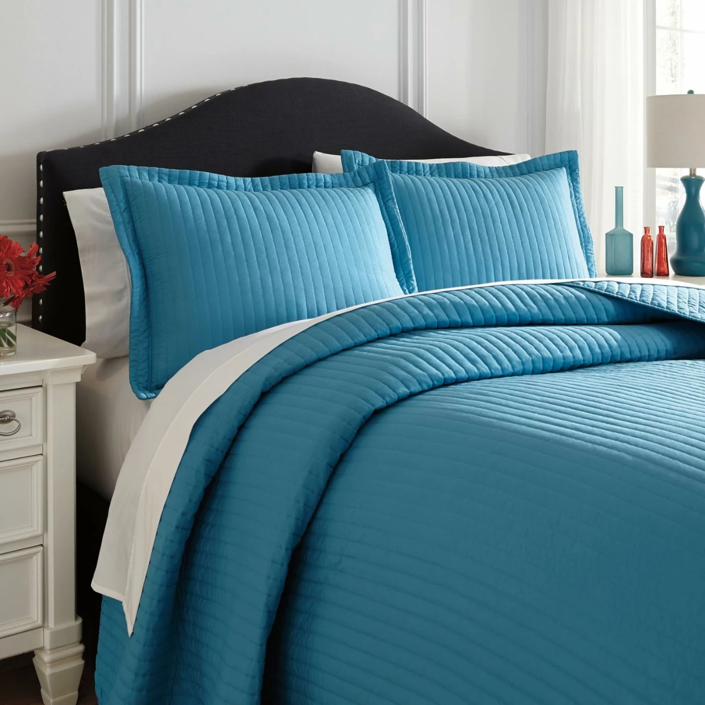 Less is more when you place this sleekly understated Raleda 3 Piece Coverlet Set by Signature Design by Ashley on your bed. Vertical channel stitching on the shams and coverlet of this set give off a subtle stripe print. This set is offered in your choice of available colors. It is machine washable for easy cleaning.