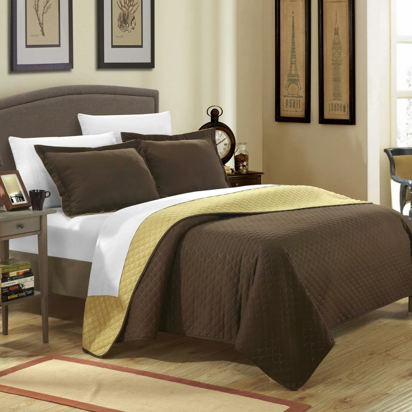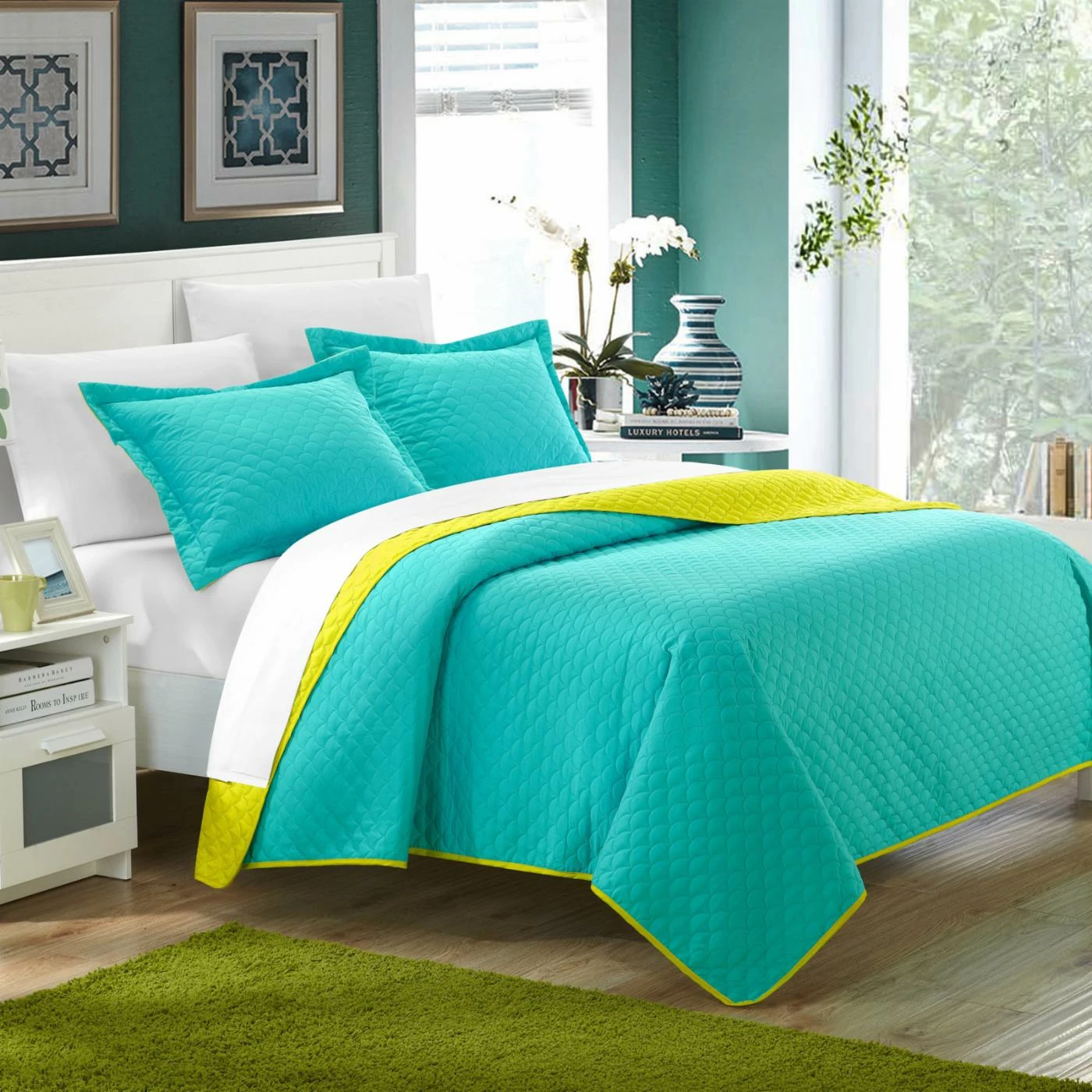 Enjoy two stylish looks in one with the Ressa 7 Piece Bed in a Bag by Chic Home set. The shams and quilt have a different solid color on each side with a textured pattern that gives the pieces added flair. Plus, the set comes with white sheets and pillowcases. This bedding is designed from luxury-grade microfiber, and features a durable design so you can enjoy lasting beauty and comfort. Machine washable, dry clean recommended.