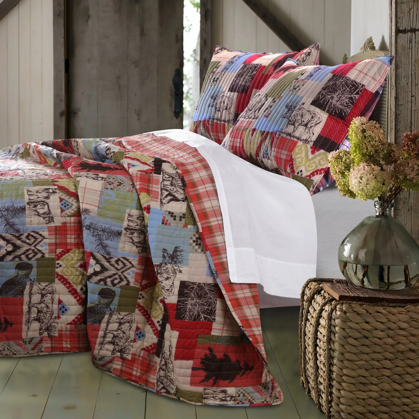 Ikat blocks, plaid, and a wilderness theme make this Rustic Lodge Quilt Set by Greenland Home Fashions a cozy way to dress your lodge-inspired bedroom. This quilt set is made of machine-washable cotton and comes in size options. The set includes the patchwork quilt that reverses to a coordinating plaid and two matching pillow shams (one for twin size).