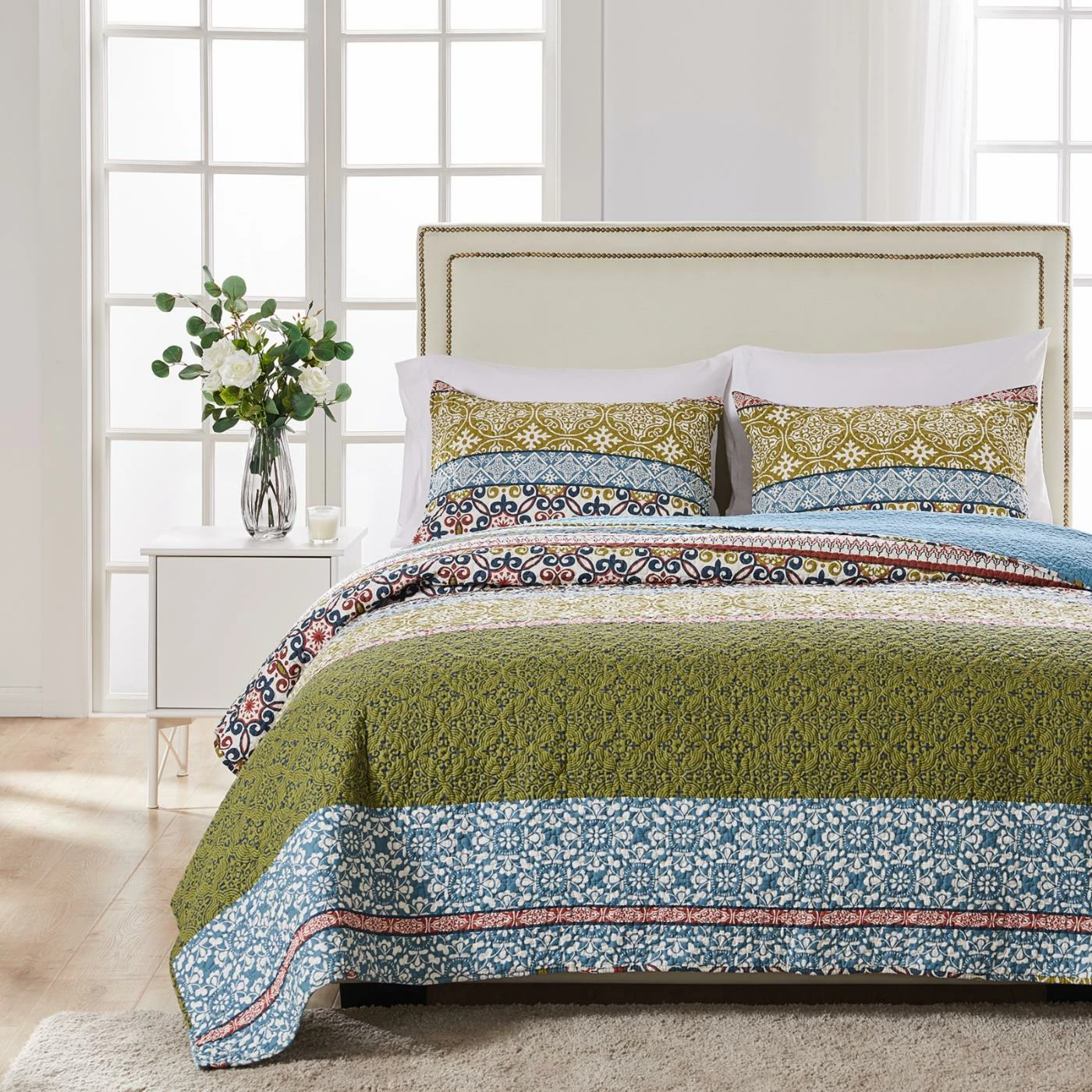 Horizontal stripes of geometric patterns and a soothing color palette make this Shangri-La Quilt Set by Greenland Home Fashions a pretty way to refresh any bedroom. A complete bedding set, this one includes a reversible quilt and two pillow shams (one sham with twin size). Pieces are made of machine-washable cotton and come in size options.