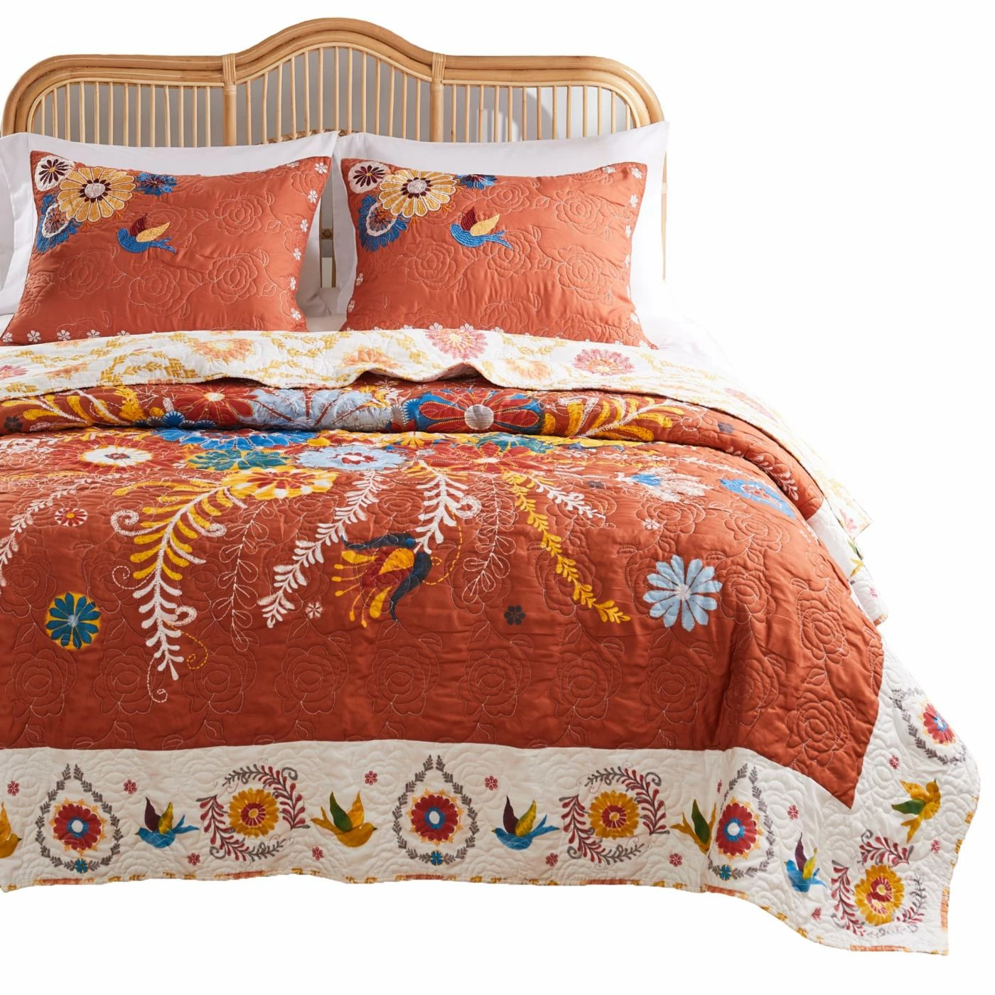 Add bohemian flair to your bedroom with the Topanga Quilt Set by Barefoot Bungalow. This quilt features a print of flowers, vines, and doves in bright hues of orange, yellow, and blue. If you want a different look, just flip the quilt over to reveal a coordinating flower and vine pattern. Made of cotton and microfiber polyester, this set features low-maintenance care. Simply throw it in your washing machine with other linens, as needed. Two matching shams are included to top off the bedspread.