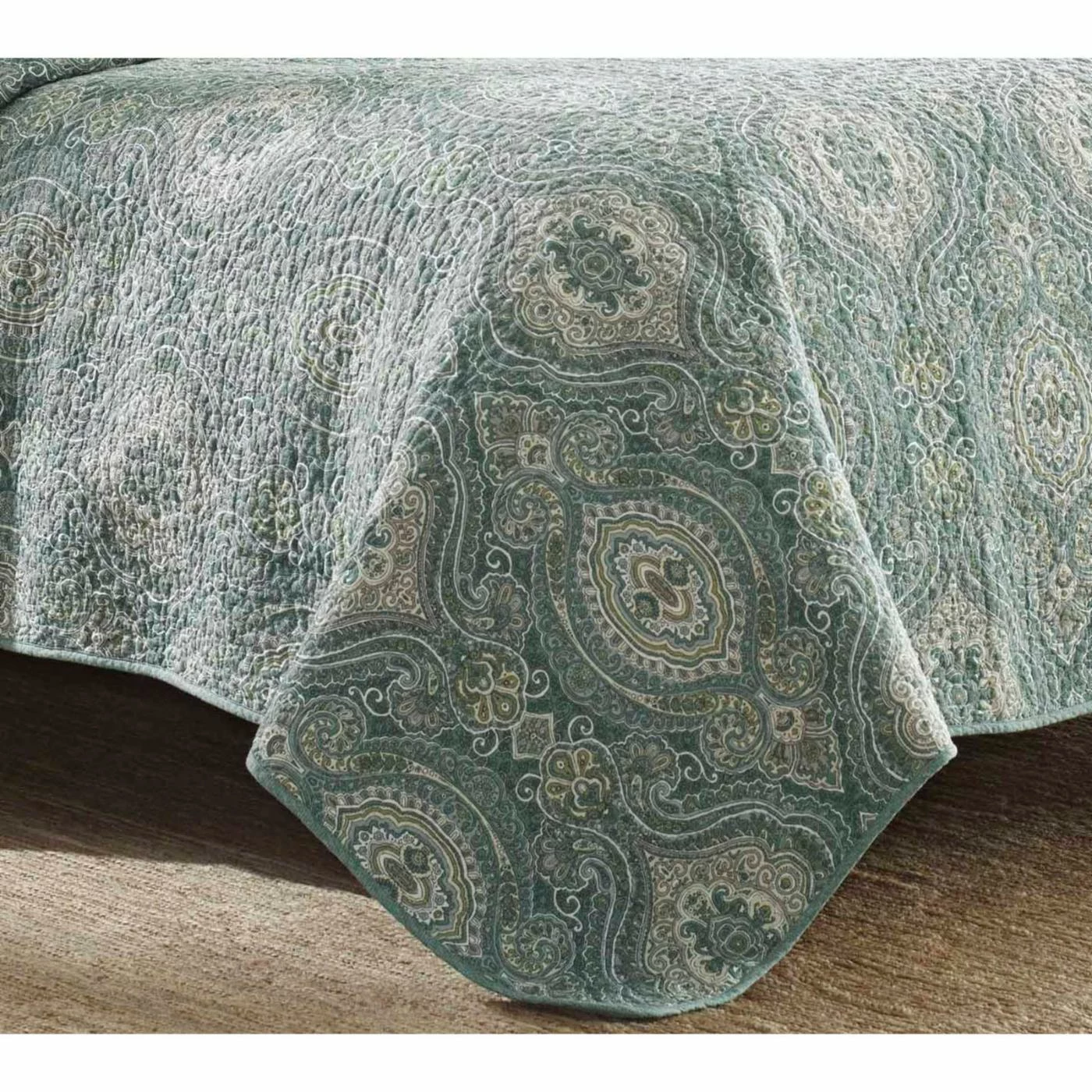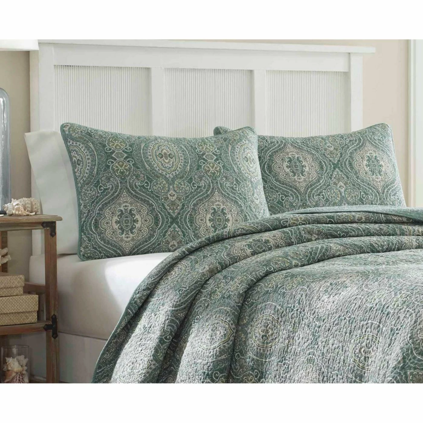 The sophisticated Turtle Cove Quilt Set by Tommy Bahama features an all over damask design in green. The quilt and matching shams reverse to a textured green print with vermicelli stitching. Each piece is made of soft cotton and is machine washable. Choose from available size options.