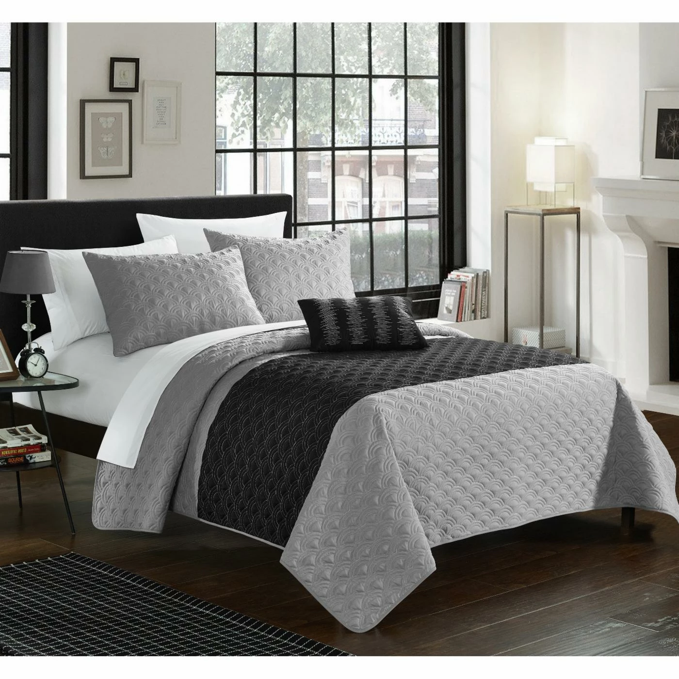 The elegantly quilted Walker 4 Piece Quilt Set by Chic Home is offered in your choice of available color scheme. This multi-piece bedding set includes a reversible quilt, two pillow shams, and one decorative pillow. Pieces are made of soft and durable microfiber. While machine washable in a large capacity front loading machine, dry cleaning is recommended.