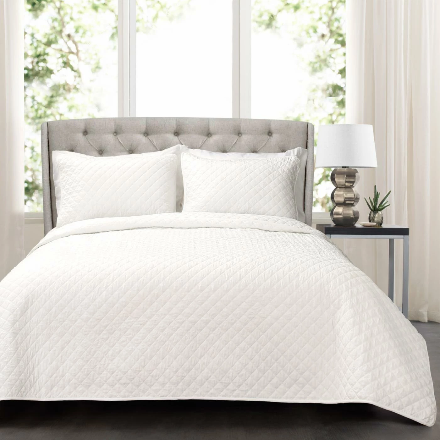 The Ava Diamond Oversized Cotton Quilt Set by Lush DΓ©cor features sleek lines in a diamond pattern, all in clean white. The 100% cotton fabric is filled with a blend of cotton and polyester. It can be machine washed on cold and tumble dried on low.