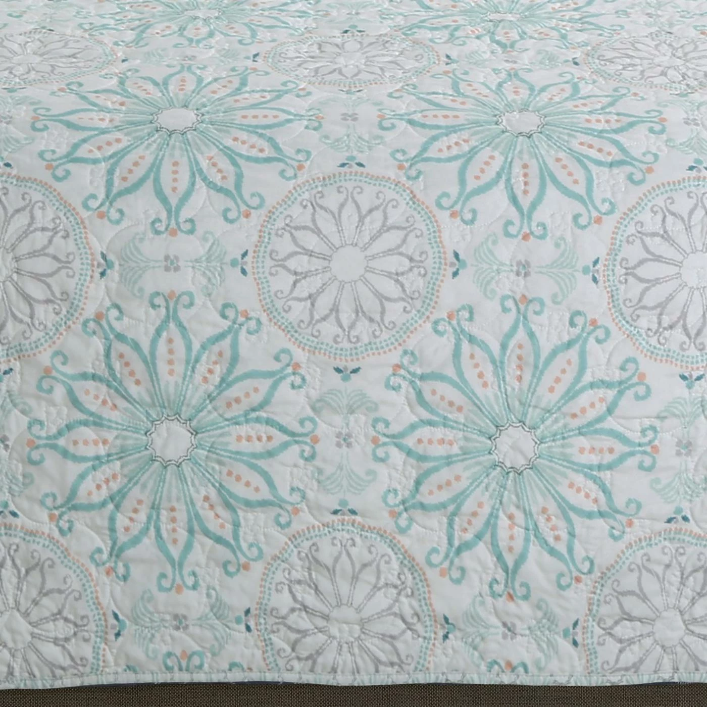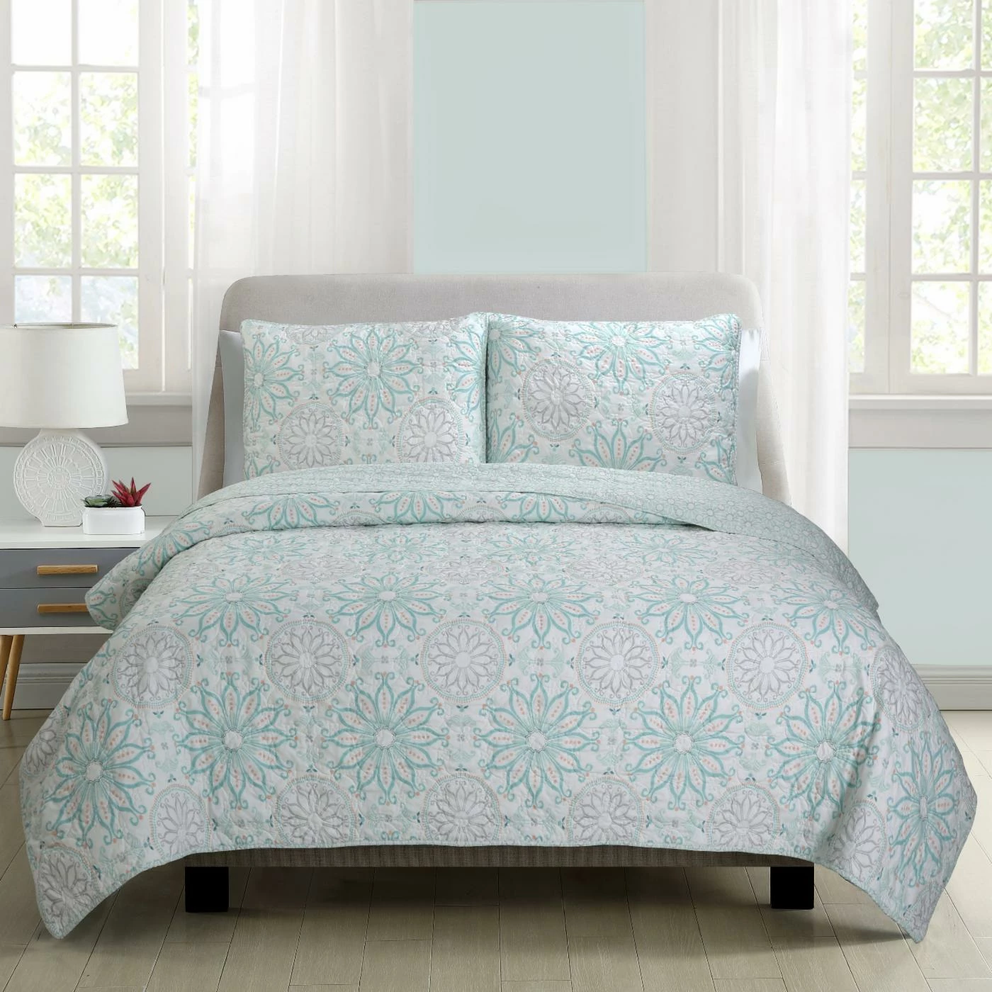 The lovely aqua and gray medallion Felicity bedding set is highlighted with a hint of warm sherbert outline dots. The reverse print is a small medallion pattern that completes the ensemble. Enjoy this bedding set in any bedroom for an updated look. Made of 100% Polyester Microfiber, 75 GSM. Fill is 250 GSM, 100% Polyester. Set includes quilt and sham(s). Machine washable. Choose from available sizes.