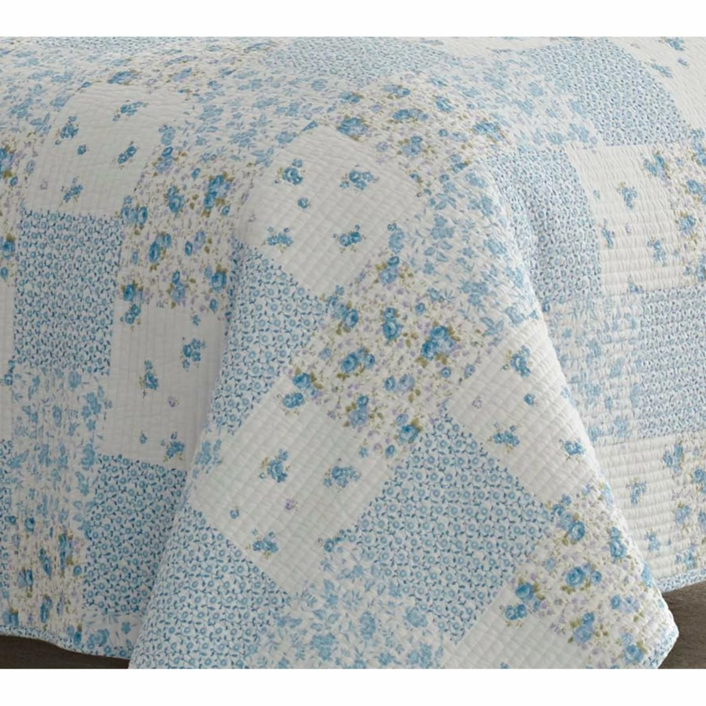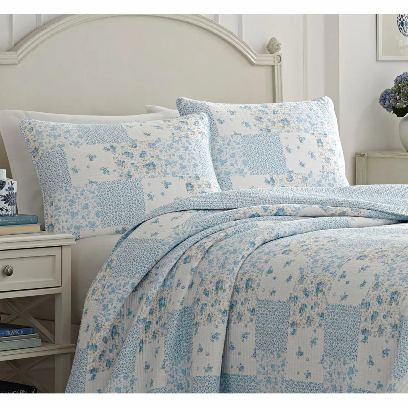 For a country fresh refresh, dress your bed in the Kenna Quilt Set by Laura Ashley. A cool blue and white palette makes this floral patchwork timeless. The quilt reverses to a coordinating smaller print for two looks in one. This set is made of pre-washed cotton and all pieces are conveniently machine washable. Choose from available size options. Twin sizes included quilt and one sham. All other sizes include quilt and two shams.