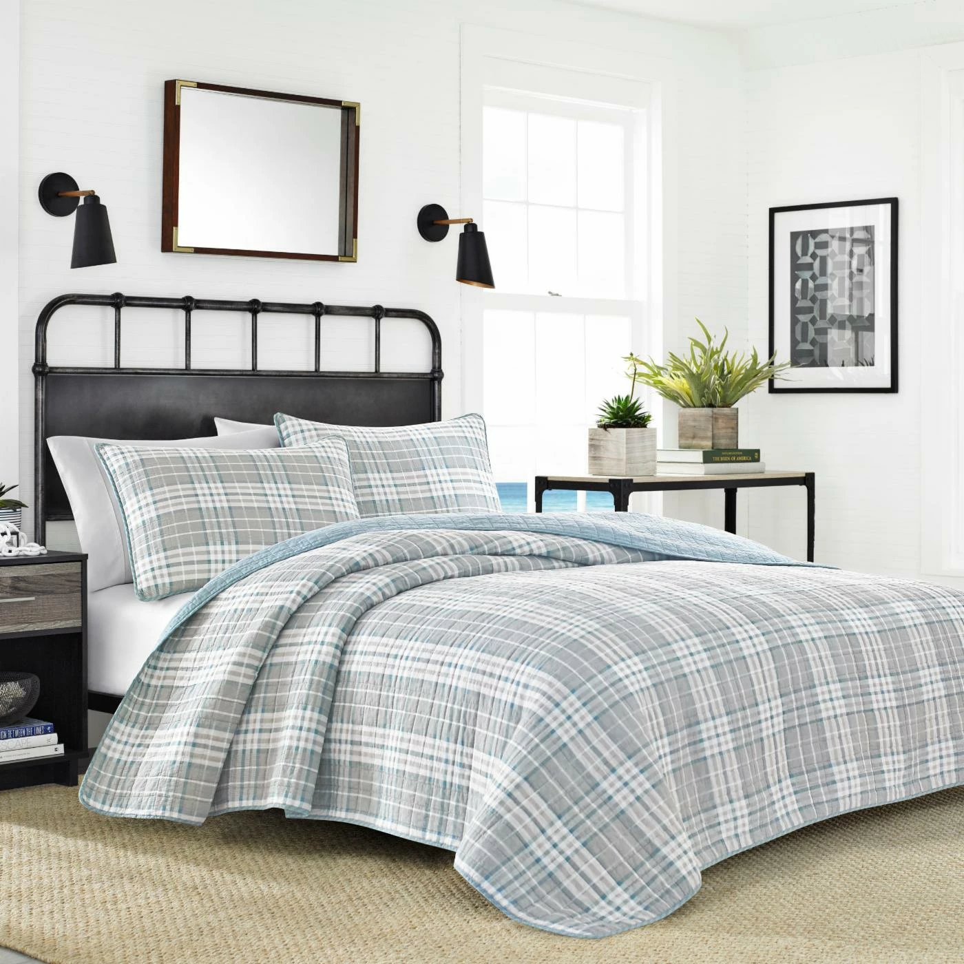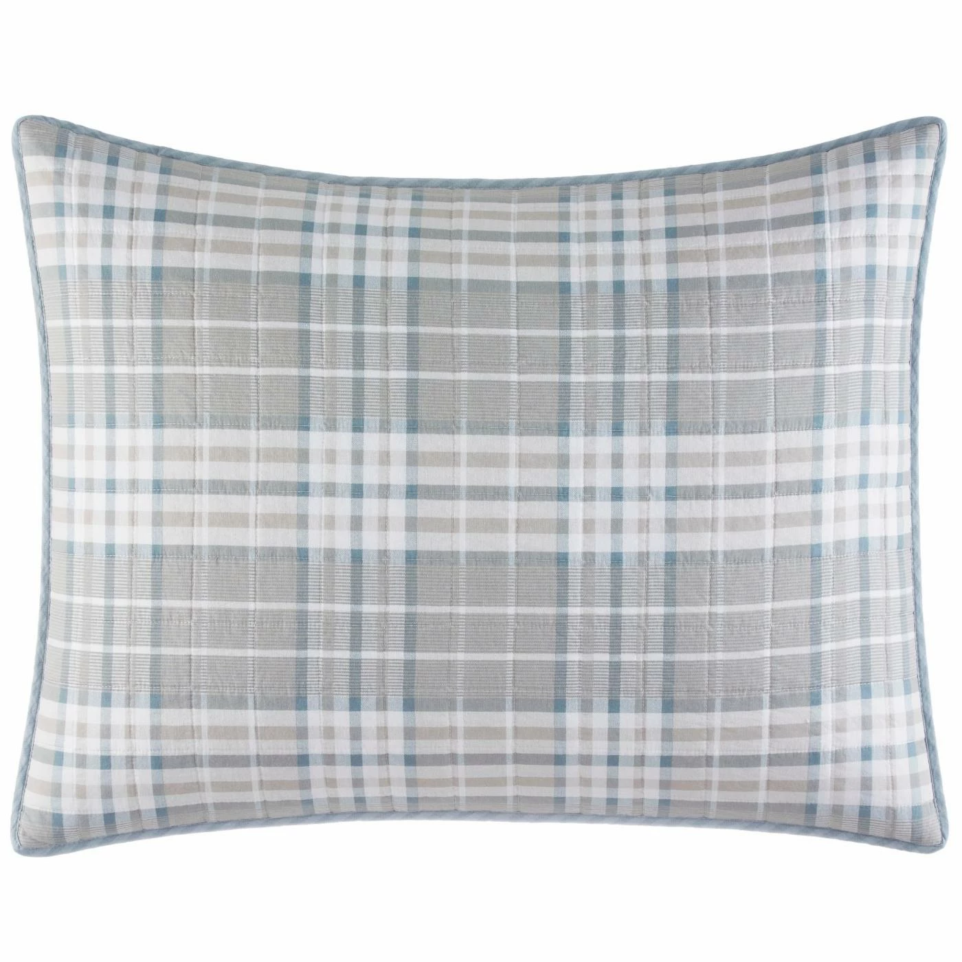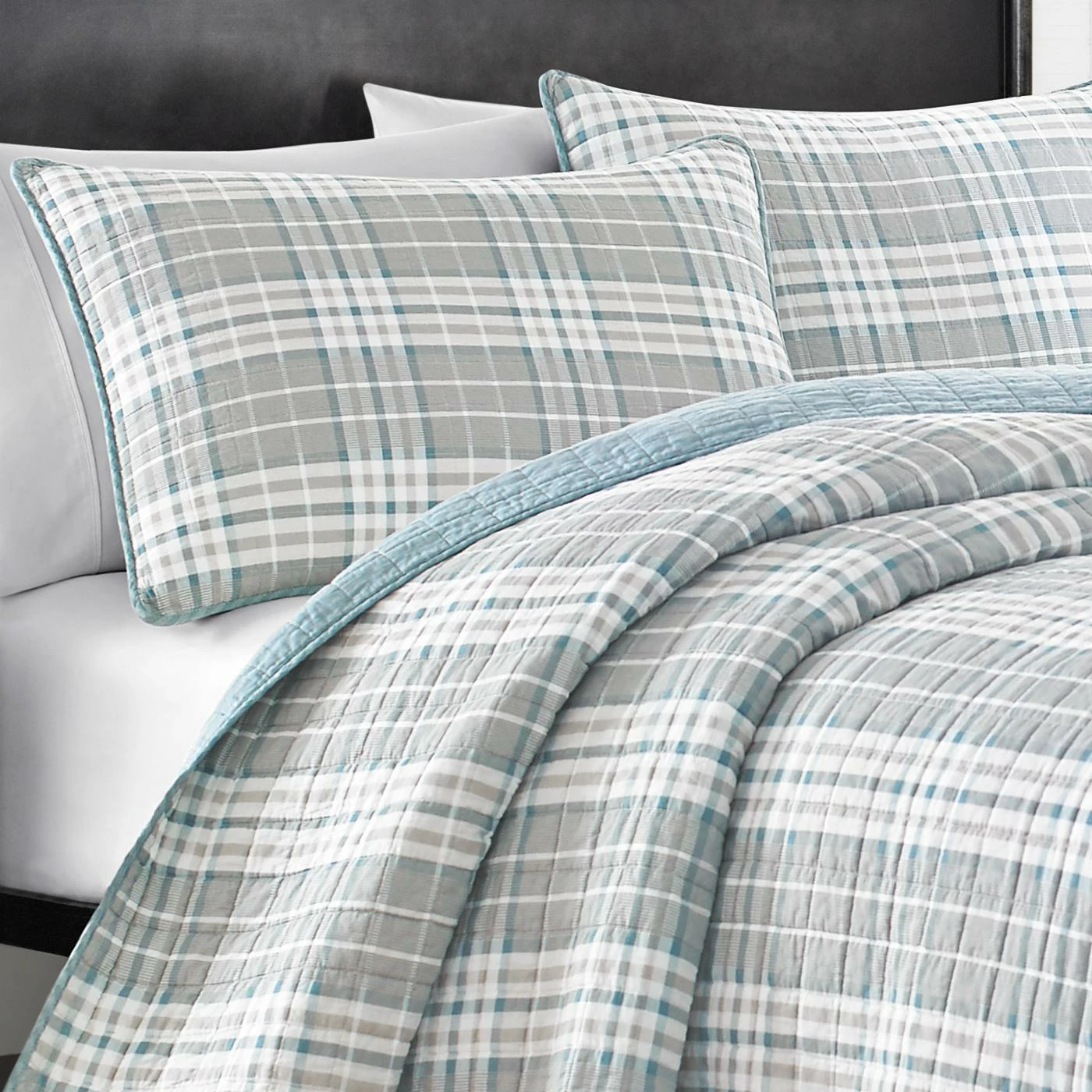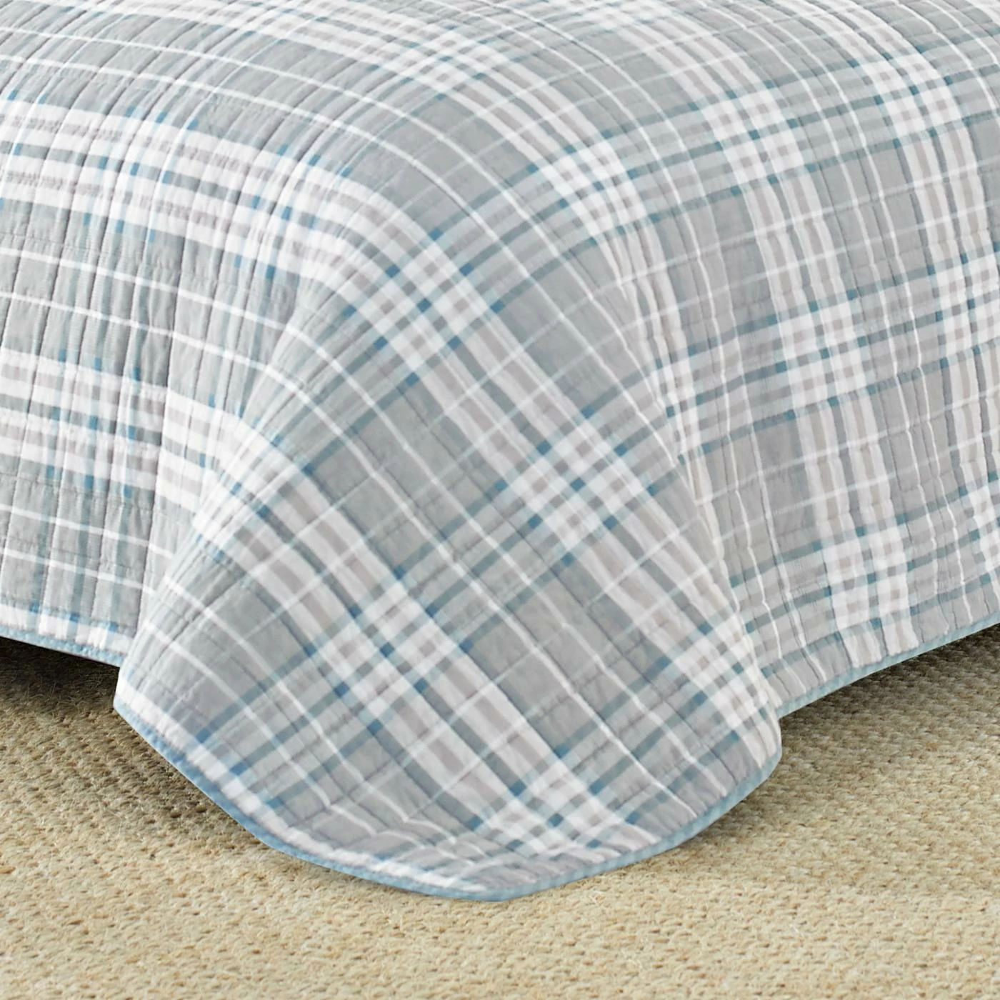 - Plaid quilt in gray, white, and blue