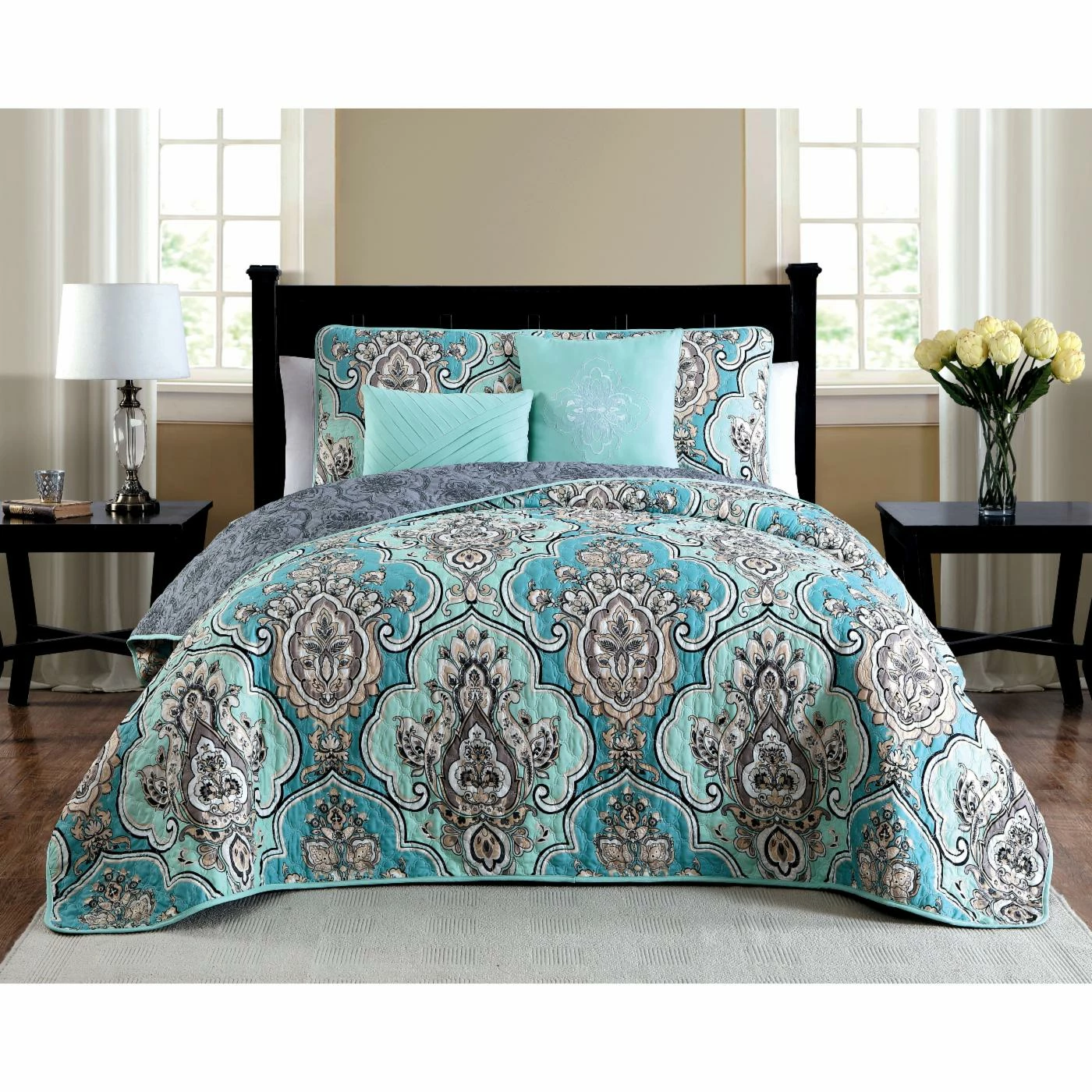 Serene and boho-chic describe the Odette 5 Piece Quilt Set by Avondale Manor. This reversible quilt features a damask pattern of teal and gray and comes with matching shams and decorative pillows. Use this set for a welcoming guest room or add it to liven up your current bedroom dΓ©cor. Plus, it’s easy to care for and machine-washable.