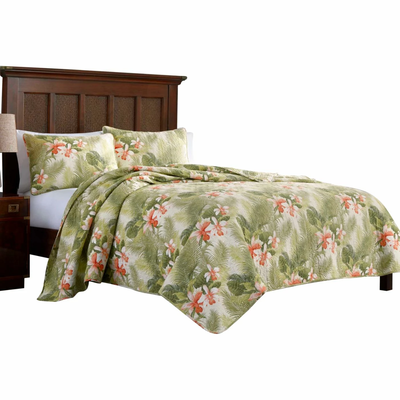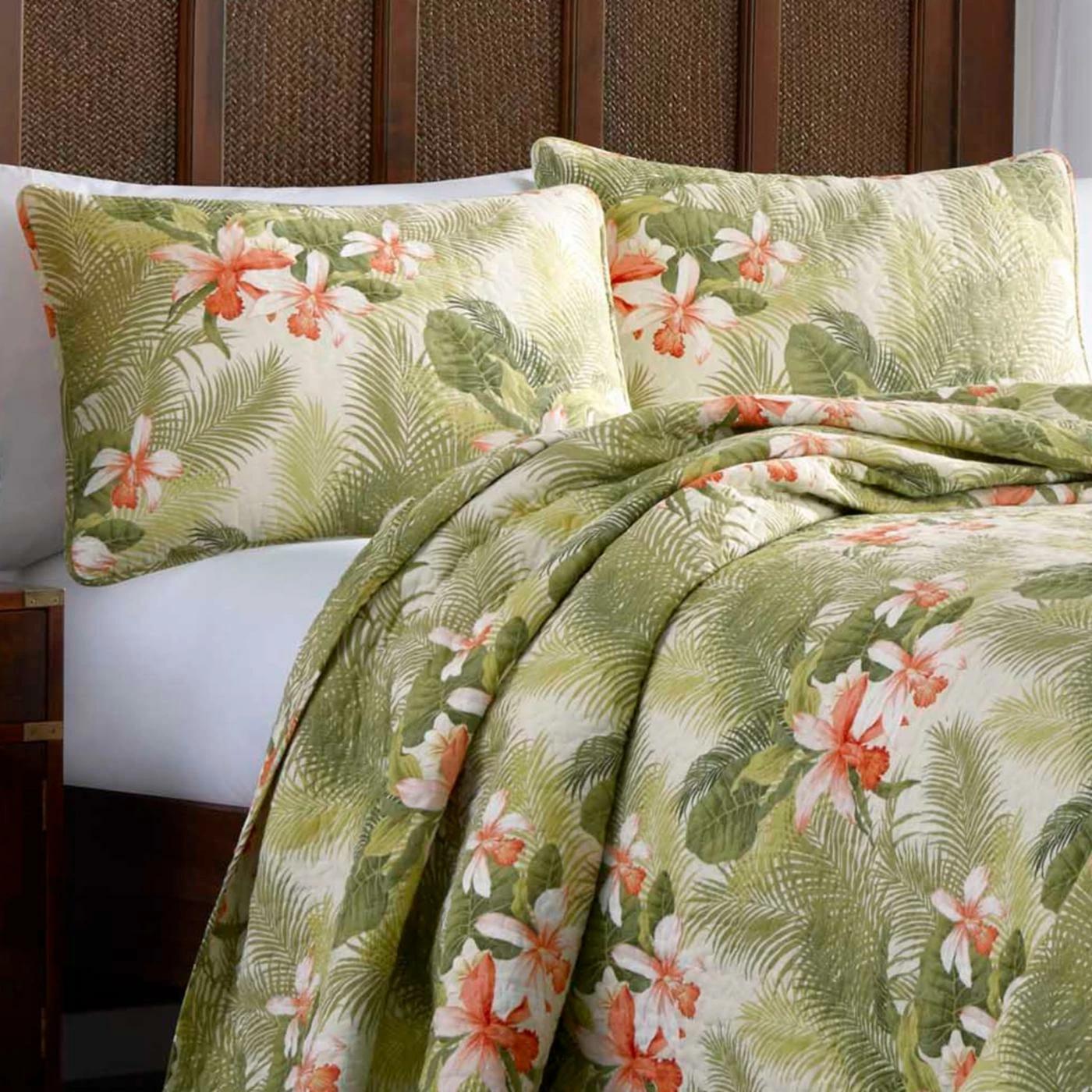 An escape to the tropics isn’t far-fetched – with the Tommy Bahama Tropical Orchid collection, it’s as close as your bedroom. Crafted with soft 100% cotton fabric, this casual bedding set includes a plush, reversible quilt with a soothing white and green tropical orchid motif on both sides. Choose a twin, full/queen, or king size – the twin set comes with one standard sham and the other sets come with two. Machine wash.