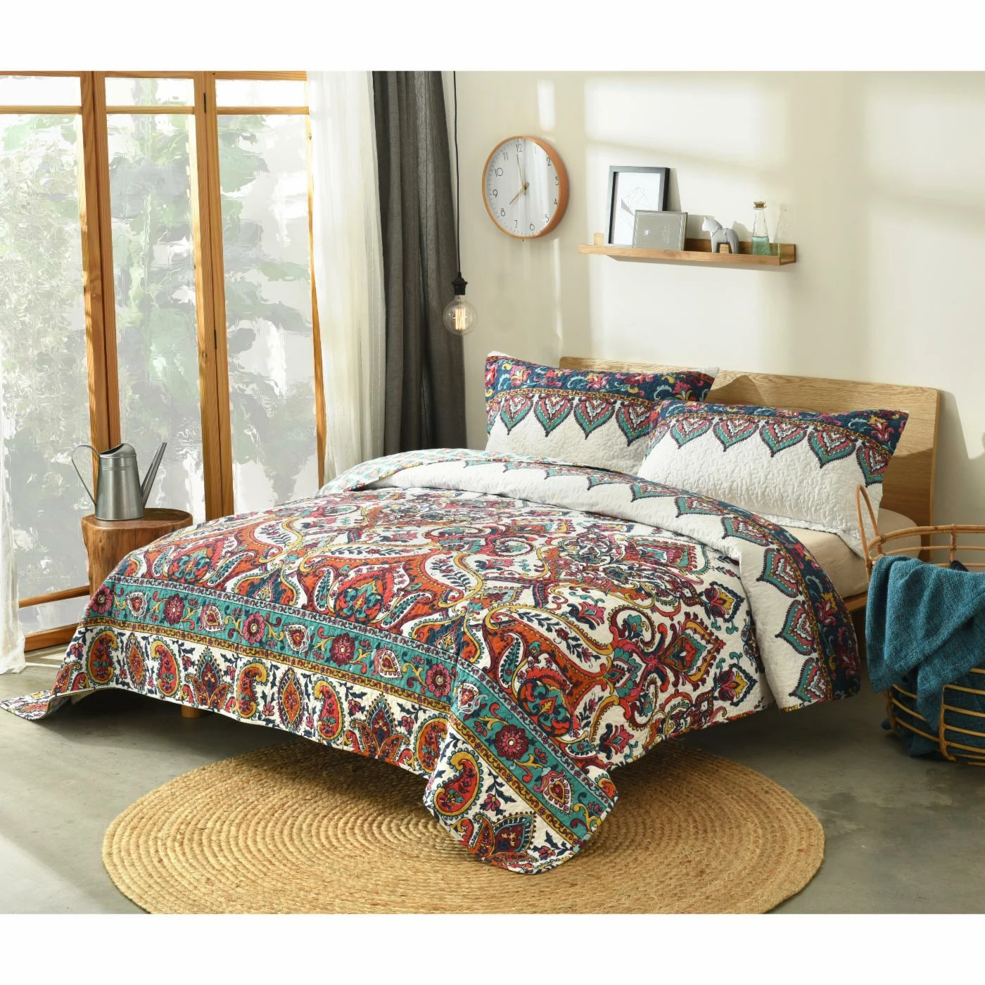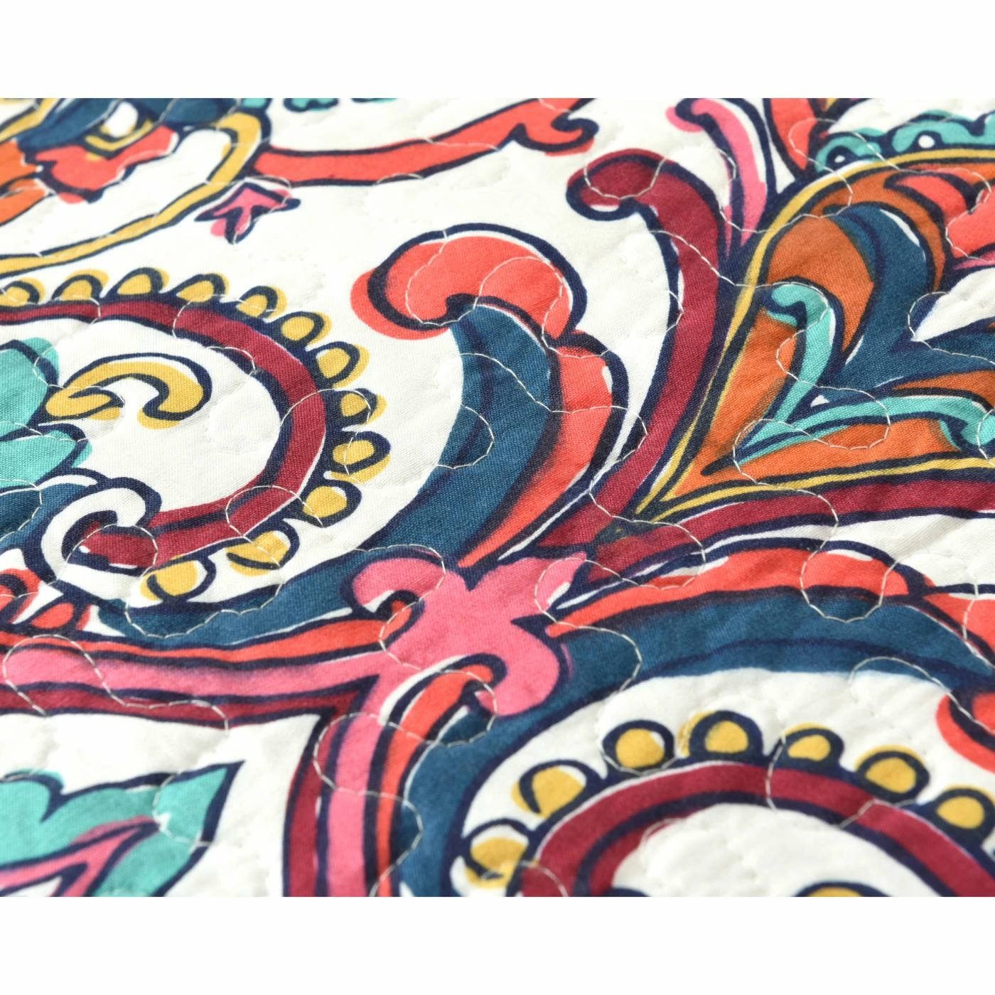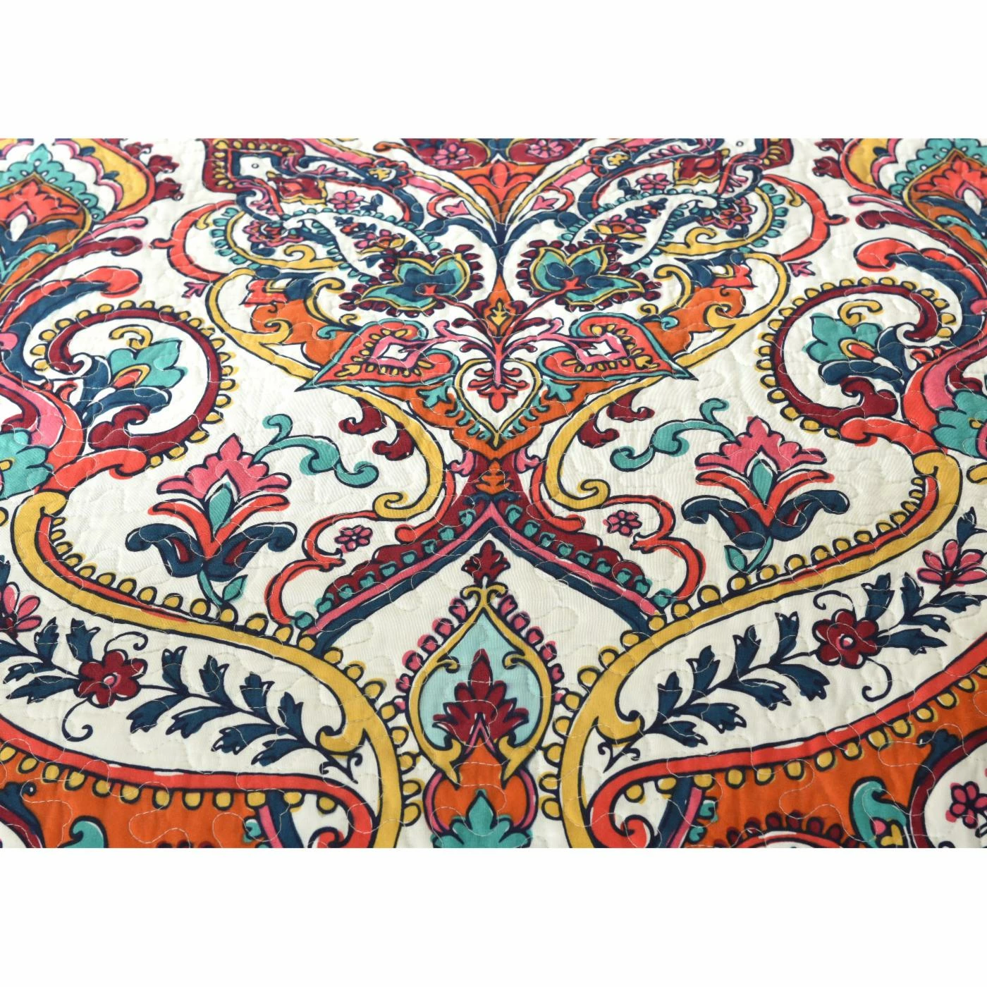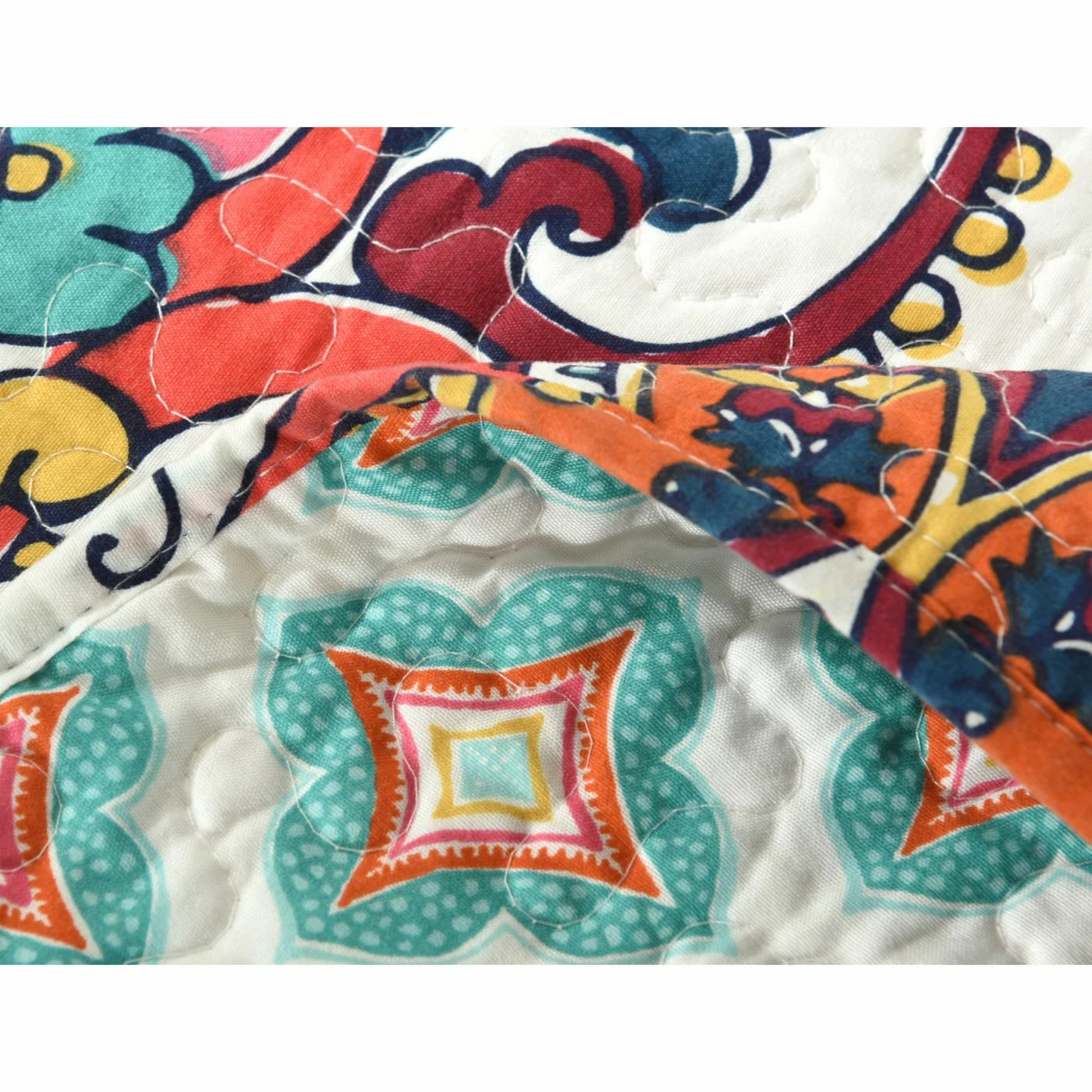Wake up your bedroom with the vibrant paisley floral stripe found on the Earthy Meadow Quilted Bedspread Set by DaDa Bedding Collection. This bedspread reverses to a small orange and aqua quatrefoil print on white. This bedding set includes its reversible bedspread and two matching pillow shams (one with twin size). Pieces are made of soft, machine-washable polyester microfiber. Choose from the available size options.
