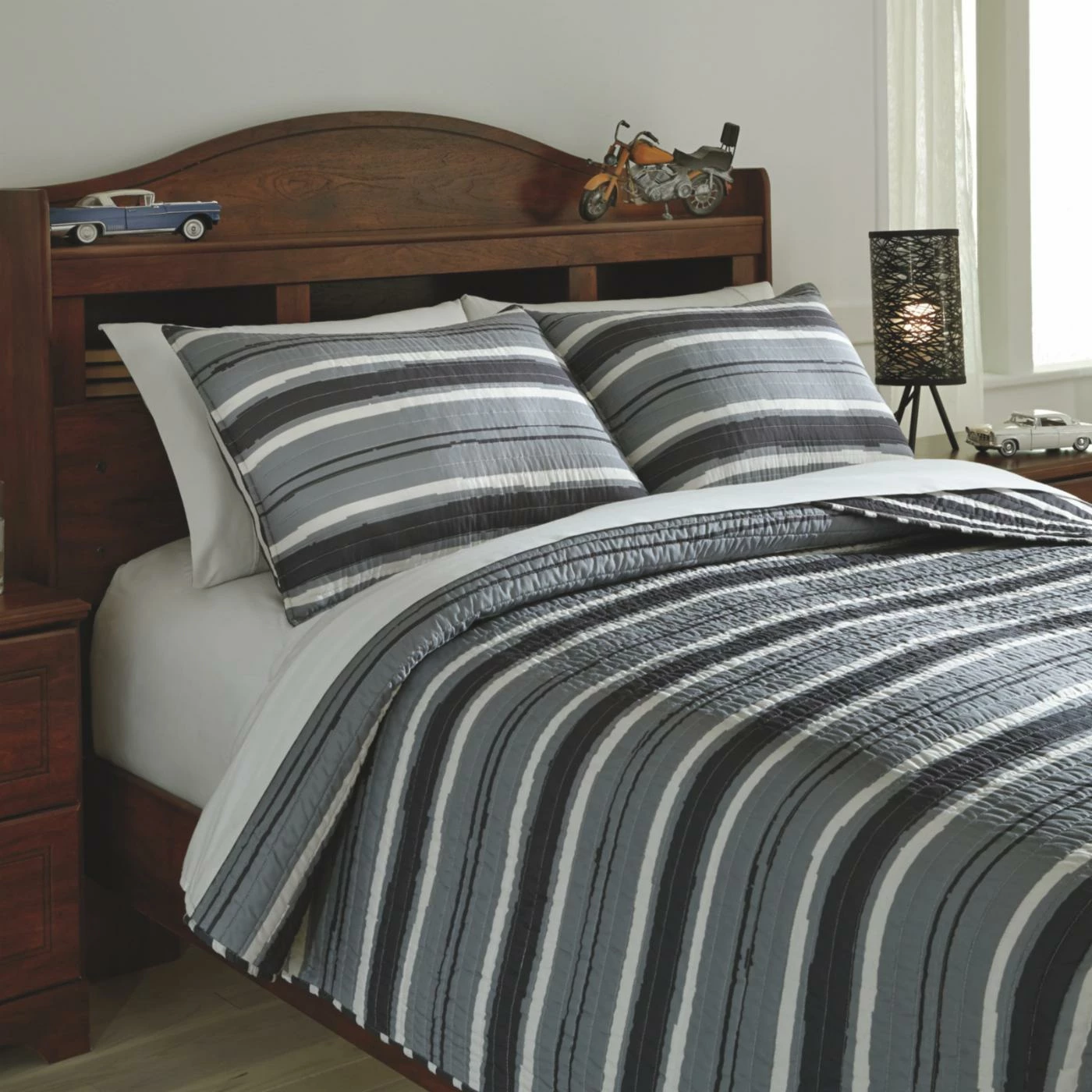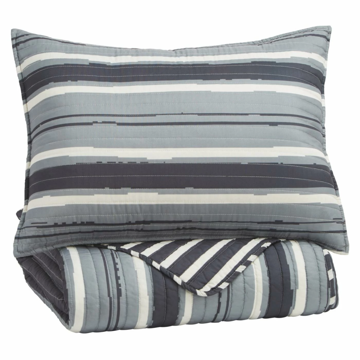 Like magic, the Merlin Coverlet Set by Signature Design by Ashley offers two styles in one. Its stylized gray and cream stripe reverses to a more uniform stripe in the same tones. This bedding set includes a machine-washable coverlet and two matching pillow shams (one with twin size options). Choose from available size options.