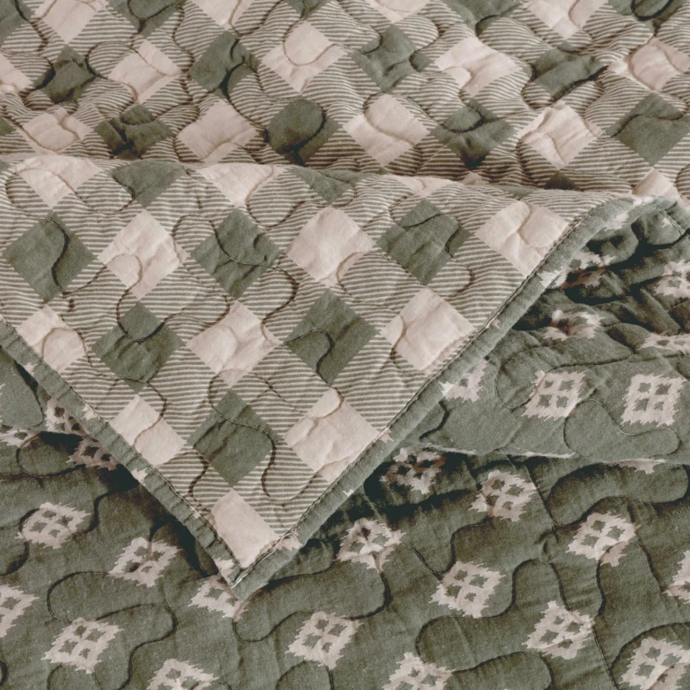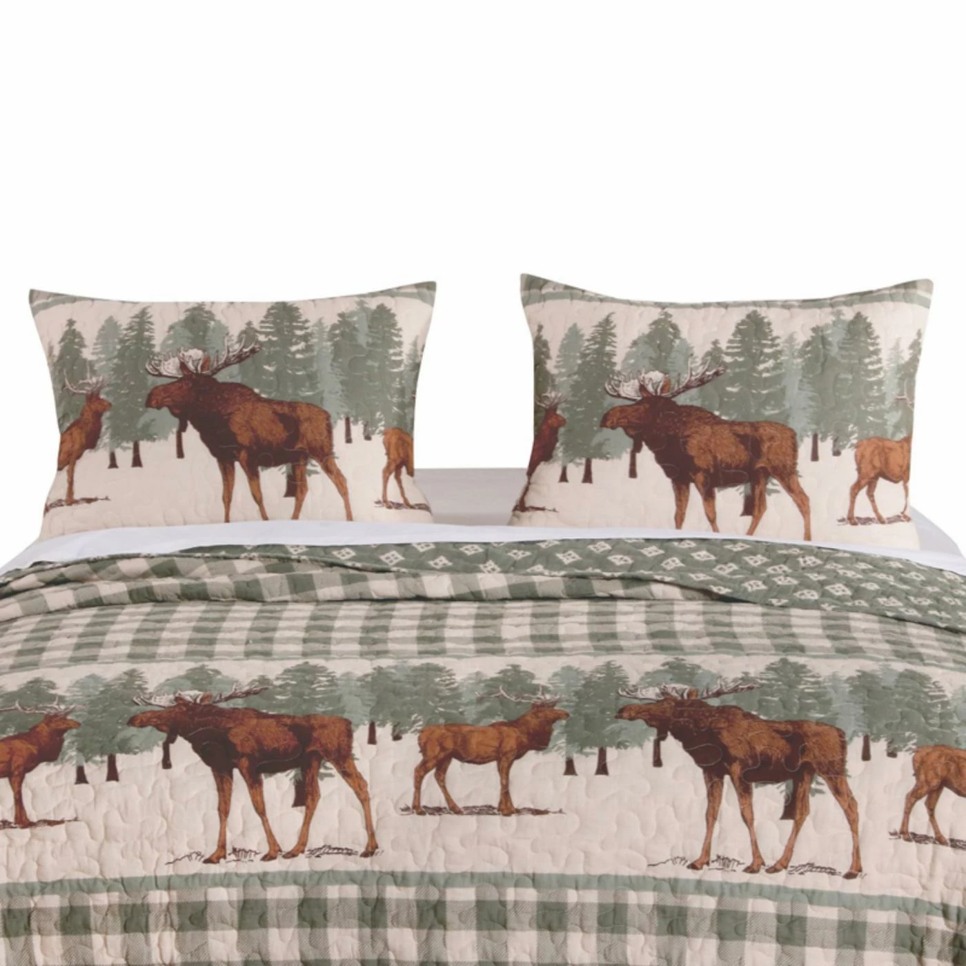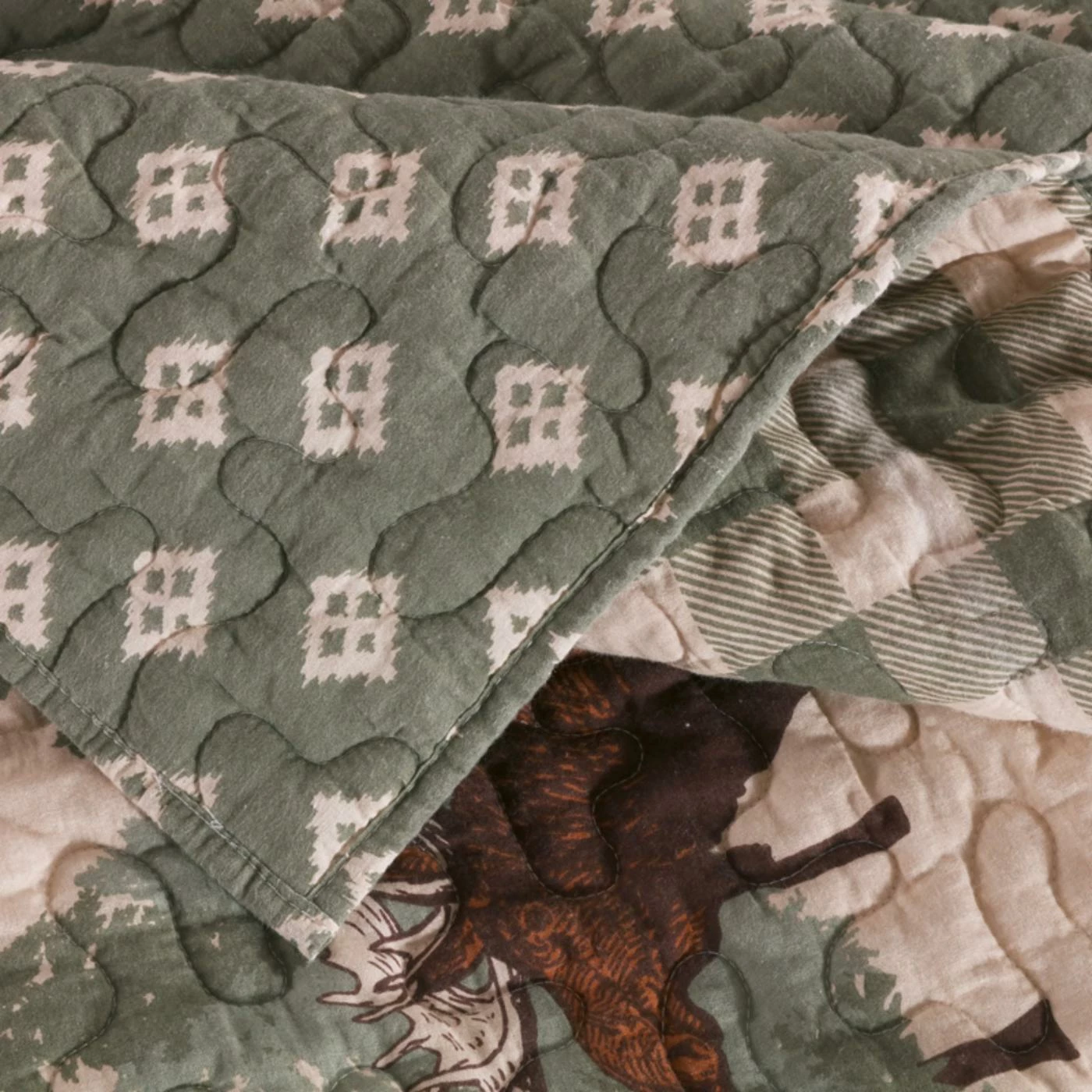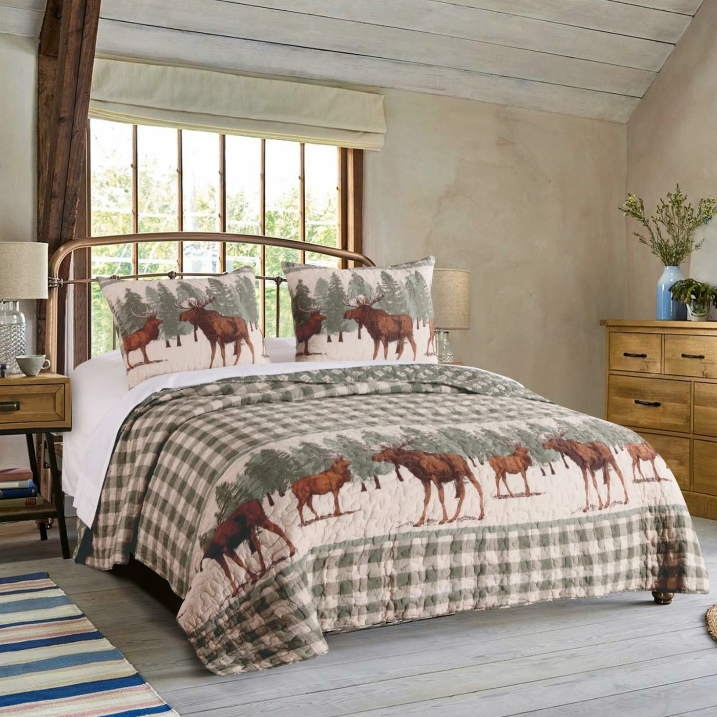 Whether you live in a cabin or you just dream of rustic life, the Moose Creek Quilt Set by Greenland Home Fashions‘s moose pattern will help you create the bedroom you want. This quilt set features a moose pattern with buffalo plaid on the front in tones of green, blue, and white. You can flip the pieces over to reveal a more subtle green and white print when you feel like switching up the look. Queen/Full and King sets include one quilt and two shams. Twin sets include the quilt and a single sham.